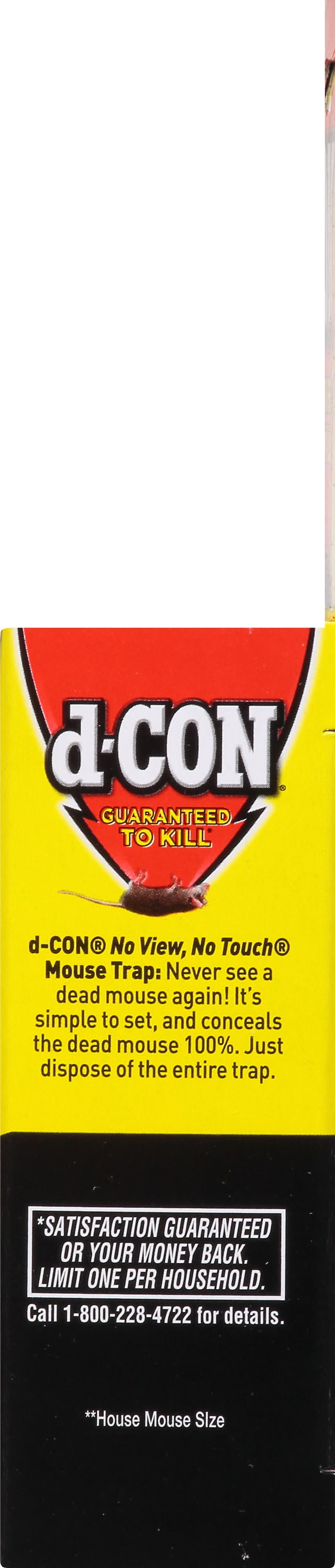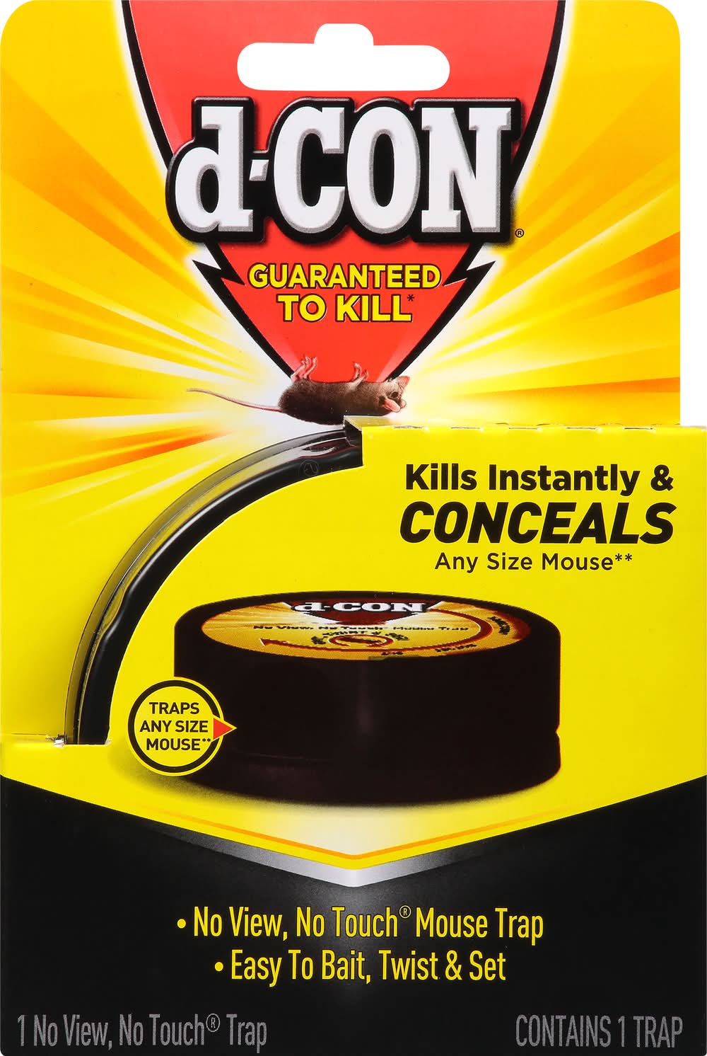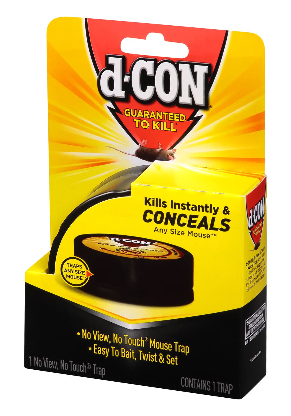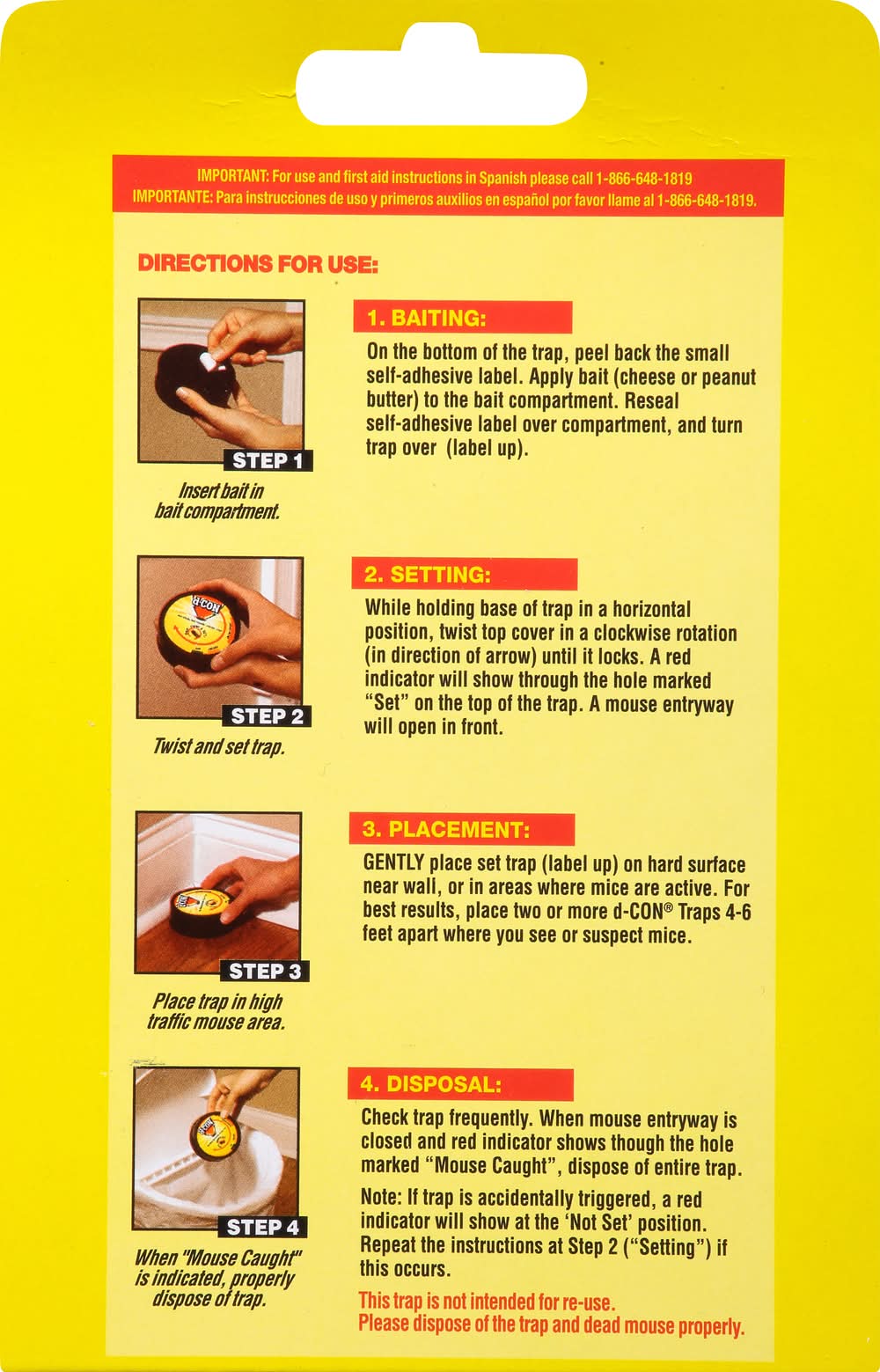 Usage of instructions:important: directions for use: step 1: insert bait in bait compartment. 1. baiting: on the bottom of the trap, peel back the small self-adhesive label. apply bait (cheese or peanut butter) to the bait compartment reseal self-adhesive label over compartment, and turn trap over (label up). step 2: twist and set trap: 2. setting: while holding base of trap in a horizontal position, twist top cover in a clockwise rotation (in direction of arrow) until it locks. a red indicator will show through the hole marked set on the top of the trap. a mouse entryway will open in front. step 3: place trap in high traffic mouse area. 3. placement: gently place set trap (label up) on hard surface near wall, or in areas where mice are active. for best results, place two or more d-con traps 4-6 feet apart where you see or suspect mice. step 4: when mouse caught is indicated, properly dispose of trap. 4. disposal: check trap frequently. when mouse entryway is dosed and red indicator shows though the hole marked mouse caught, dispose of entire trap. note: if trap is accidentally triggered, a red indicator will show at the not set position. repeat the instructions at step 2 (setting) if this occurs. - directions: important: directions for use: step 1: insert bait in bait compartment. 1. baiting: on the bottom of the trap, peel back the small self-adhesive label. apply bait (cheese or peanut butter) to the bait compartment reseal self-adhesive label over compartment, and turn trap over (label up). step 2: twist and set trap: 2. setting: while holding base of trap in a horizontal position, twist top cover in a clockwise rotation (in direction of arrow) until it locks. a red indicator will show through the hole marked set on the top of the trap. a mouse entryway will open in front. step 3: place trap in high traffic mouse area. 3. placement: gently place set trap (label up) on hard surface near wall, or in areas where mice are active. for best results, place two or more d-con traps 4-6 feet apart where you see or suspect mice. step 4: when mouse caught is indicated, properly dispose of trap. 4. disposal: check trap frequently. when mouse entryway is dosed and red indicator shows though the hole marked mouse caught, dispose of entire trap. note: if trap is accidentally triggered, a red indicator will show at the not set position. repeat the instructions at step 2 (setting) if this occurs.