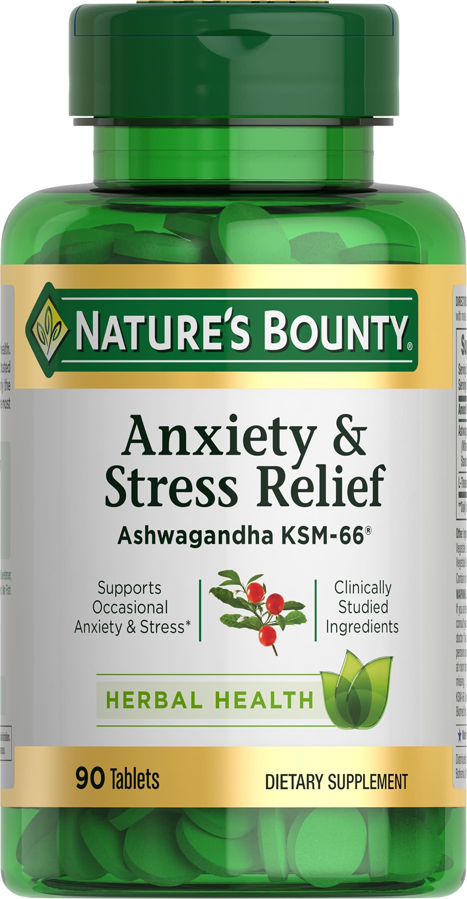 Nature's Bounty Anxiety & Stress Relief Tablets are a dietary supplement designed to support a calm, relaxed mood and provide support for occasional anxiety and stress. Each serving contains 200 mg of L-theanine. The product is free from artificial flavors, sugar, gluten, sodium, artificial colors, artificial sweeteners, starch, soy, wheat, yeast, and fish, making it suitable for vegetarians. It is formulated with non-GMO ingredients and has been clinically studied. The herbal health tablets have been laboratory tested to ensure quality. They have been manufactured by a brand with nearly 50 years of experience in producing trusted health products. Made in the USA with select ingredients sourced globally, these tablets are a reflection of the brand's commitment to purity and science-backed health solutions. Packaging: Reusable