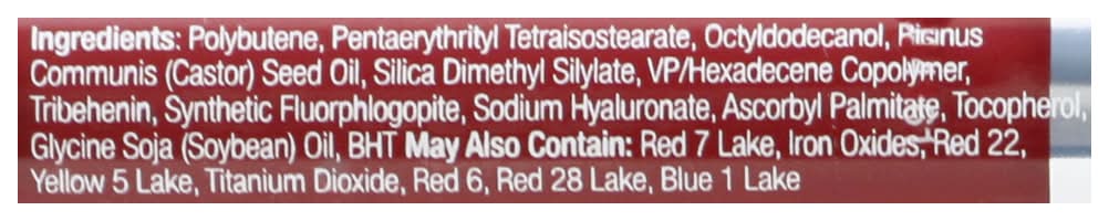Ingredients: Polybutene, Pentaerythrityl Tetraisostearate, Octyldodecanol, Ricinus Communis (Castor) Seed Oil, Silica Dimethyl Silylate, VP/Hexadecene Copolymer, Tribehenin, Synthetic Fluorphlogopite, Sodium Hyaluronate, Ascorbyl Palmitate, Tocopherol, Glycine Soja (Soybean) Oil, BHT, May Also Contain: Red 7 Lake, Iron Oxides, Red 22, Yellow 5 Lake, Titanium Dioxide, Red 6, Red 28 Lake, Blue 1 Lake Contains: Soybeans