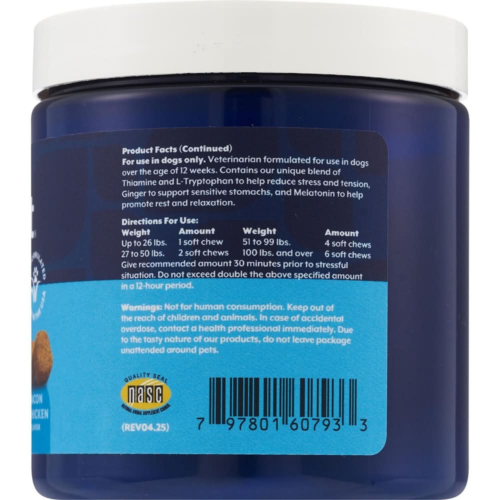 Help your pup find their zen with the perfect way to turn stress into snuggles! Whether it’s a thunderstorm, a fireworks show, or just a case of the zoomies-gone-wild, these tasty soft chew supplements are designed to promote relaxation and ease nervous tension. Formulated with a soothing blend of Melatonin, Ginger, L-Tryptophan, and Thiamine, these calming chews help support a relaxed state of mind without causing drowsiness. Plus, with a bacon and chicken flavor dogs love, giving them is easy and stress-free. we believe in proactive pet care, because a calm pup is a happy pup. That’s why our Supplement formula is crafted with high-quality ingredients and backed by over 30 years of pet wellness expertise. Whether you're prepping for travel, vet visits, or simply helping your best friend through a stressful moment, these soft chews are here to keep tails wagging and hearts happy. Because when your dog feels good, life is simply more paw some. is a 30-year pioneer and present-day innovator, manufacturing high-quality pet products designed to support the health, wellness, and quality of life for pets and pet parents. Promotes Relaxation Reduces Stress – Formulated with Melatonin, L-Tryptophan, and Thiamine to help calm anxious pups during storms, travel, fireworks, and separation. Helps Ease Nervous Tension – Ginger supports sensitive stomachs, making this a great choice for dogs prone to motion sickness or travel jitters. Veterinarian Formulated