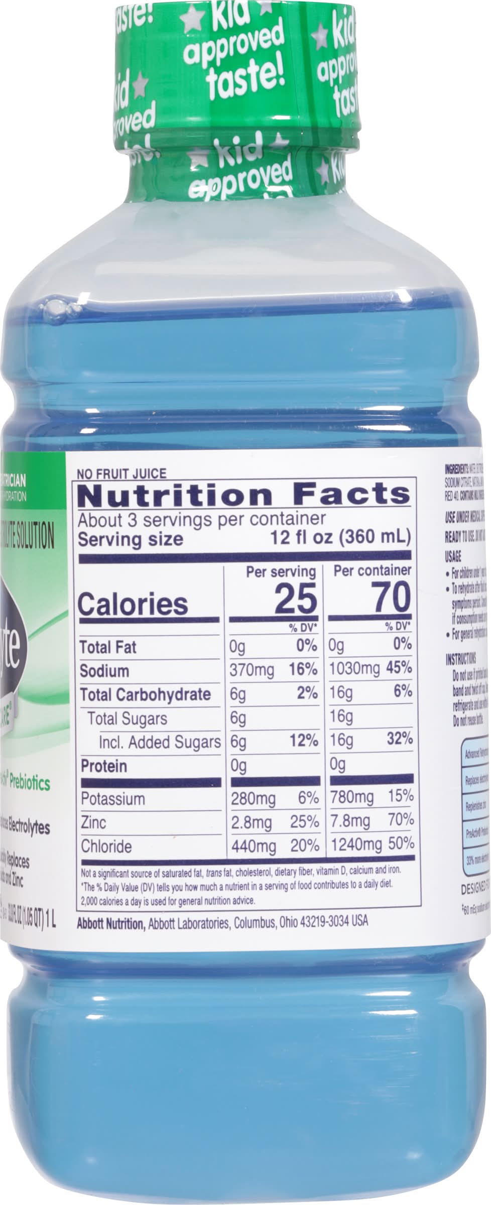 Usage of instructions usage: for children under 1 year of age: consult your doctor. to rehydrate after fluid loss: begin with small frequent sips. 1-2 liters per day may be needed while symptoms persist. consult your doctor if vomiting, fever, or diarrhea continues beyond 24 hours or if consumption needs are greater than 2 liters per day. for general rehydration: sip as needed. instructions: do not use if printed band around cap or inner foil seal is missing or broken. remove protective band and twist off cap. remove and throw away protective foil seal. after opening, replace cap, refrigerate and use within 48 hours. store unopened bottles in a cool place. avoid excessive heat. do not reuse bottle. - directions: usage: for children under 1 year of age: consult your doctor. to rehydrate after fluid loss: begin with small frequent sips. 1-2 liters per day may be needed while symptoms persist. consult your doctor if vomiting, fever, or diarrhea continues beyond 24 hours or if consumption needs are greater than 2 liters per day. for general rehydration: sip as needed. instructions: do not use if printed band around cap or inner foil seal is missing or broken. remove protective band and twist off cap. remove and throw away protective foil seal. after opening, replace cap, refrigerate and use within 48 hours. store unopened bottles in a cool place. avoid excessive heat. do not reuse bottle. tastes best served cold.