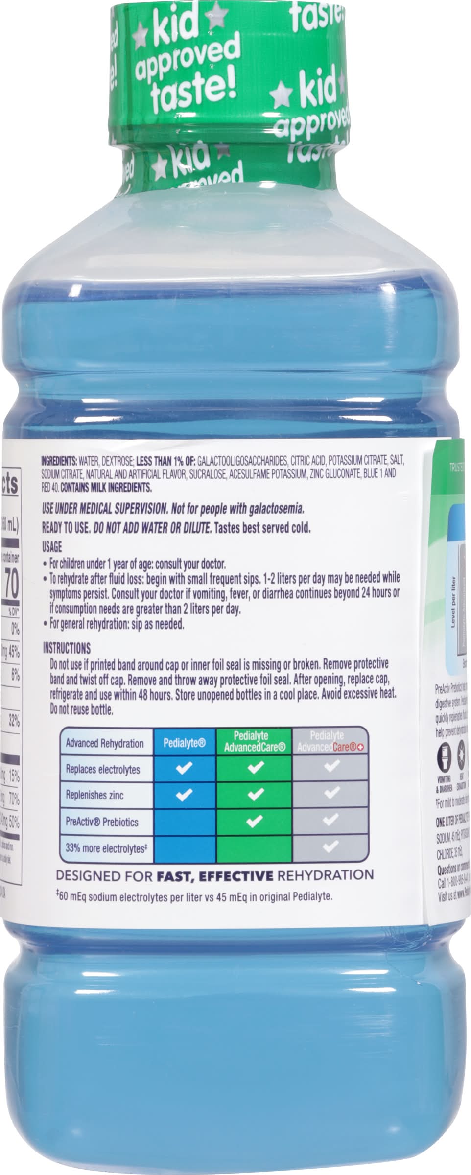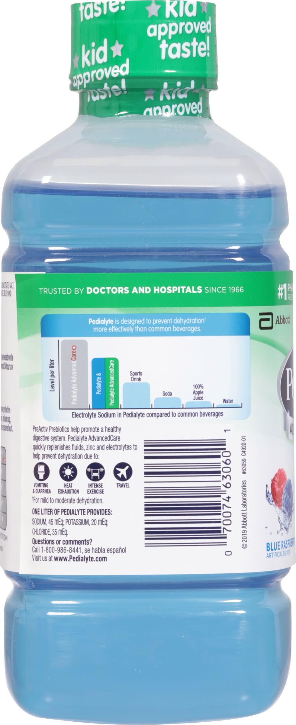 Artificial flavor. One Liter of Pedialyte Provides: 45 mEq sodium; 20 mEq potassium; 35 mEq chloride. Halal. + zinc & selenium. PreActiv prebiotics. Nutrient for immune support. No. 1 pharmacist & pediatrician recommended brand for hydration. Advanced Care with immune support. Key nutrients for immune support (Nutrients include: Zinc and selenium). Prebiotics to help promote digestive health. Pedialyte is designed to prevent dehydration (For mid to moderate hydration) more effectively than common beverages. Level Per Liter Pedialyte Advanced Care Pedialyte & Pedialyte Advanced Care. Sports drink. Soda. 100% apple juice. Water. Electrolyte Sodium in Pedialyte compared to common beverage. Pedialyte Advanced Care with Immune Support quickly replenishes fluids and electrolytes to help prevent dehydration due to: Vomiting & diarrhea, heat exhaustion, intense exercise, and travel. Vomiting & diarrhea; heat exhaustion; intense exercise; travel. Ready to use. Advanced Rehydration: Pedialyte: Replaces electrolytes; replenish zinc. Pedialyte Advanced Care: Replaces electrolytes; replenish zinc; PreActiv Prebiotics. Pedialyte Advanced Care: Replaces electrolytes; replenish zinc; PreActiv Prebiotics; 33% more electrolytes (60 mEq sodium electrolytes per liter vs 45 mEq in original Pedialyte). Flavor: Blue raspberry