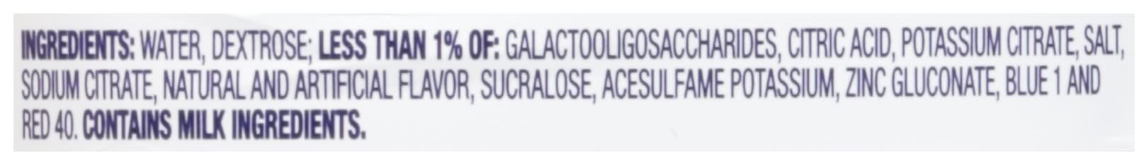 Ingredients: Water, Dextrose; Less than 1% of: Galactooligosaccharides, Citric Acid, Potassium Citrate, Salt, Sodium Citrate, Natural and Artificial Flavor, Sucralose, Acesulfame Potassium, Zinc Gluconate, Blue 1 and Red 40 Contains: Milk