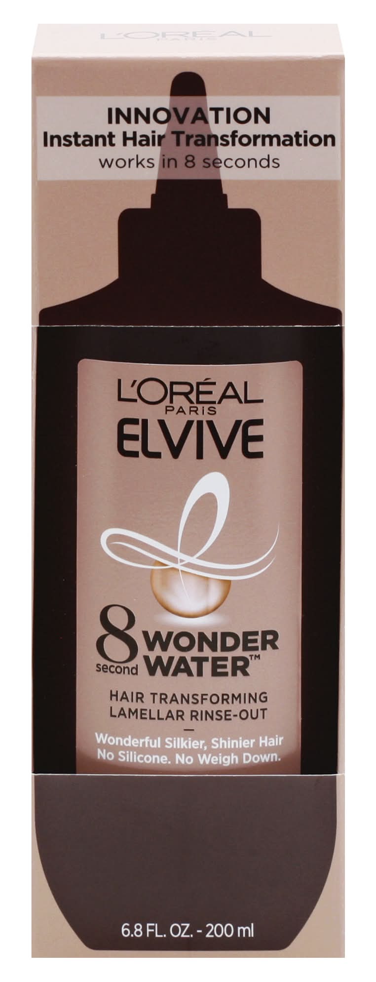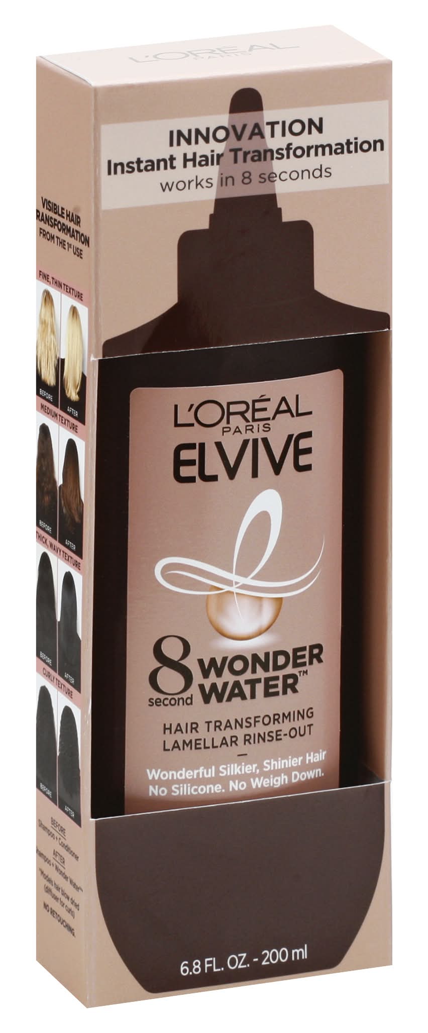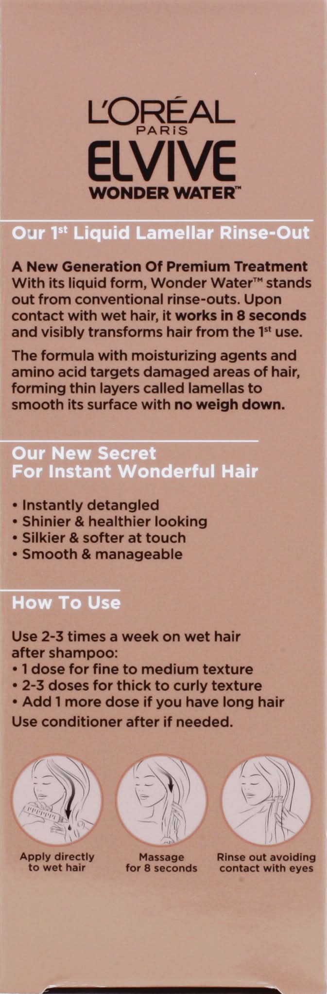 Hair transforming lamellar rinse-out. Innovation. Instant hair transformation. Works in 8 seconds. Wonderful silkier, shinier hair. No silicone. No weigh down. Our 1st Liquid Lamellar Rinse-Out: A new generation of premium treatment with its liquid form, Wonder Water stands out from conventional rinse-outs. Upon contact with wet hair, it works in 8 seconds and visibly transforms hair from the 1st use. The formula with moisturizing agents and amino acid targets damaged areas of hair, forming thin layers called lamellas to smooth its surface with no weigh down. Our new secret for instant wonderful hair: Instant detangled; Shinier & healthier looking; Silkier & softer at touch; Smooth & manageable. Visible hair transformation from the 1st use. Before: Shampoo + conditioner. After: Shampoo + Wonder Water (Models hair blow dried [diffuser for curls]). No retouching. www.lorealparis.com. Questions? Call 1-800-631-7358. Made in Canada with Canadian and/or imported parts. Loreal, New York, NY 10001