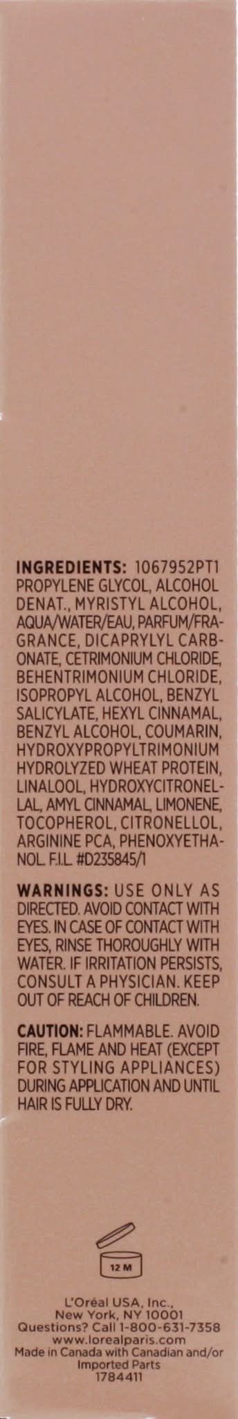Ingredients: Propylene Glycol, Alcohol Denat, Myristyl Alcohol, Aqua/Water/Eau, Parfum/Fragrance, Dicaprylyl Carbonate, Cetrimonium Chloride, Behentrimonium Chloride, Isopropyl Alcohol, Benzyl Salicylate, Hexyl Cinnamal, Benzyl Alcohol, Coumarin, Hydroxypropyltrimonium Hydrolyzed Wheat Protein, Linalool, Hydroxycitronellal, Amyl Cinnamal, Limonene, Tocopherol, Citronellol, Arginine PCA, Phenoxyethanol Contains: Wheat