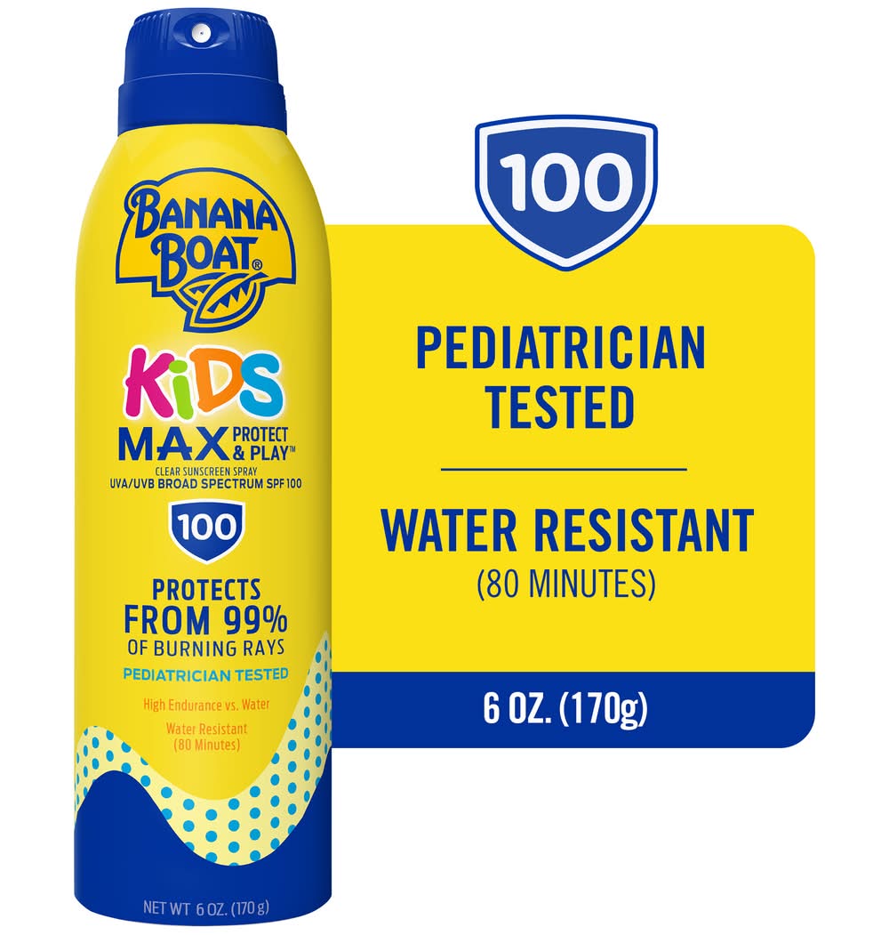 Give your active kids our highest level of protection in a convenient easy-to-apply continuous spray, now with an even better fragrance! Banana Boat Kids Max Protect & Play Clear Sunscreen Spray offers our highest level of SPF protection SPF 100 and provides broad spectrum UVA and UVB protection. Banana Boat Kids Max Protect Clear Sunscreen Spray is a hypoallergenic formula that goes on clear, and is pediatrician tested, so it's gentle on your child's sensitive skin. This formula is water resistant for up to 80 MINUTES. Banana Boat Kids Max Protect Clear Sunscreen Spray is recommended by the Skin Cancer Foundation. HSA/FSA Eligible SPF 100 blocks 99% of UVB rays HYPOALLERGENIC FORMULA that is PEDIATRICIAN TESTED WATER RESISTANT for up to 80 MINUTES Recommended by Skin Cancer Foundation Gentle on Kids' skin Edgewell Personal Care Brands, LLC, Shelton,CT,06484