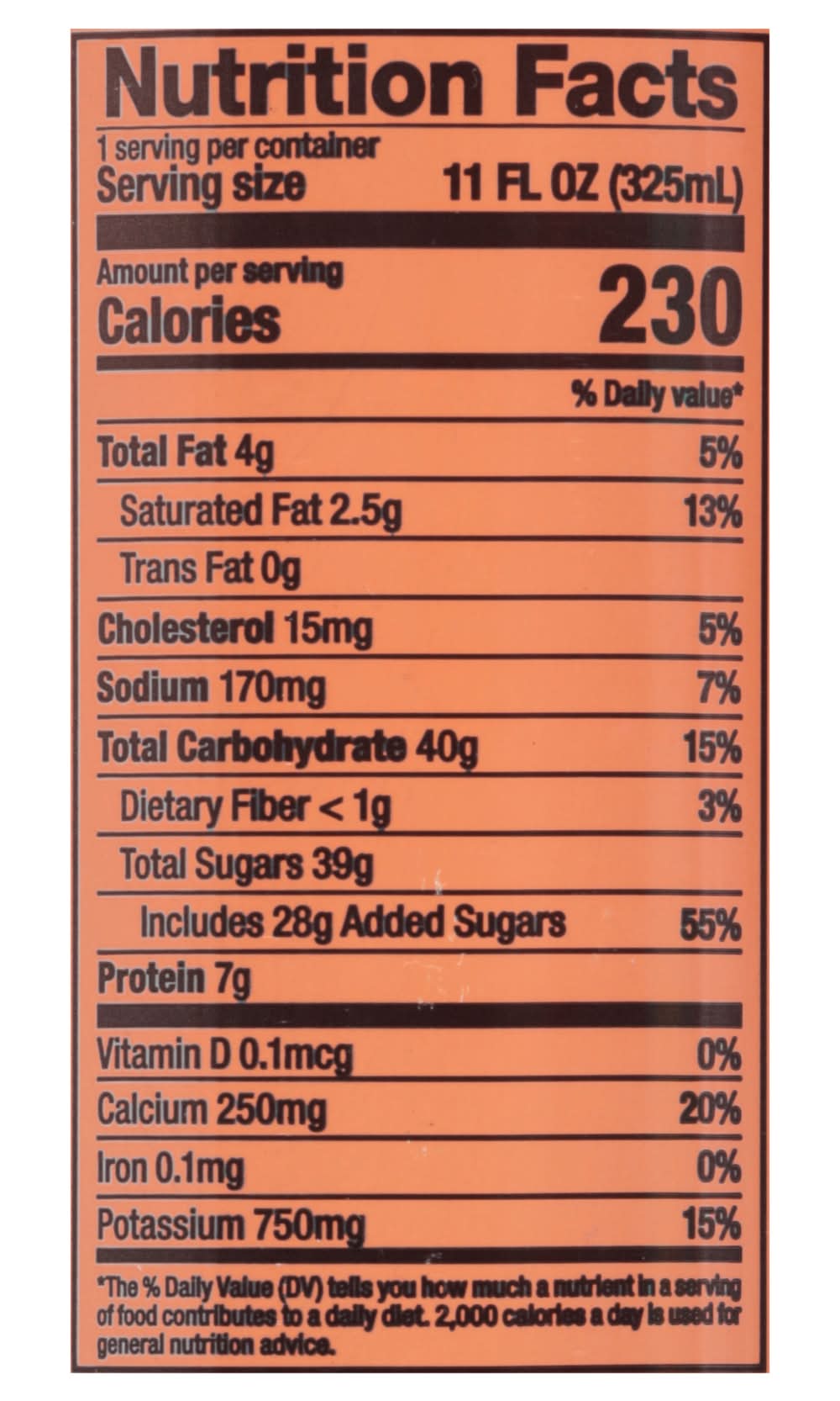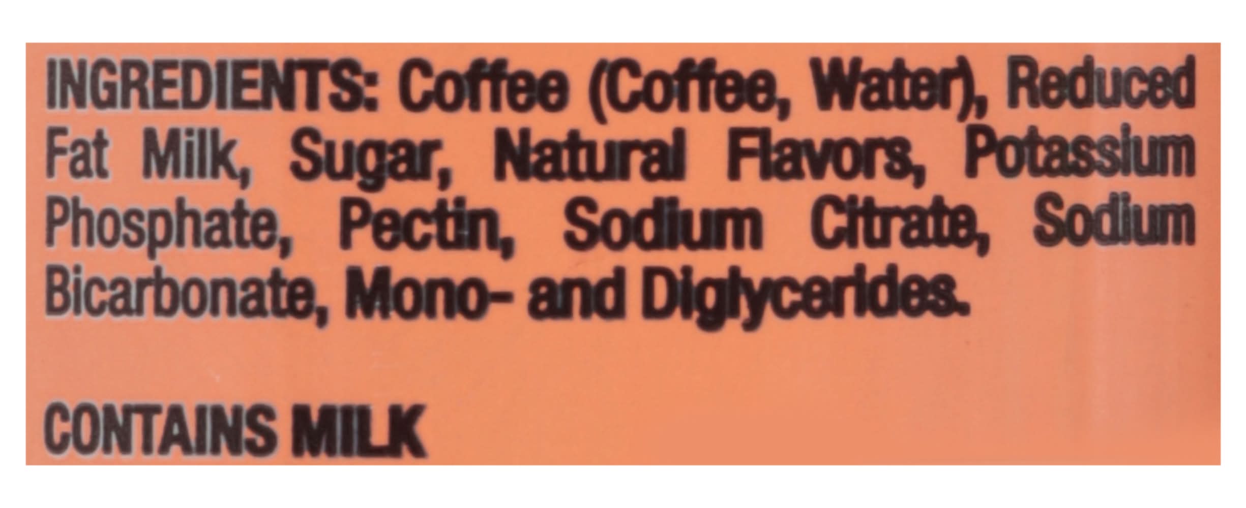 Ingredients: Coffee (Coffee, Water), Reduced Fat Milk, Sugar, Natural Flavors, Potassium Phosphate, Pectin, Sodium Citrate, Sodium Bicarbonate, Mono- and Diglycerides Contains: Milk
