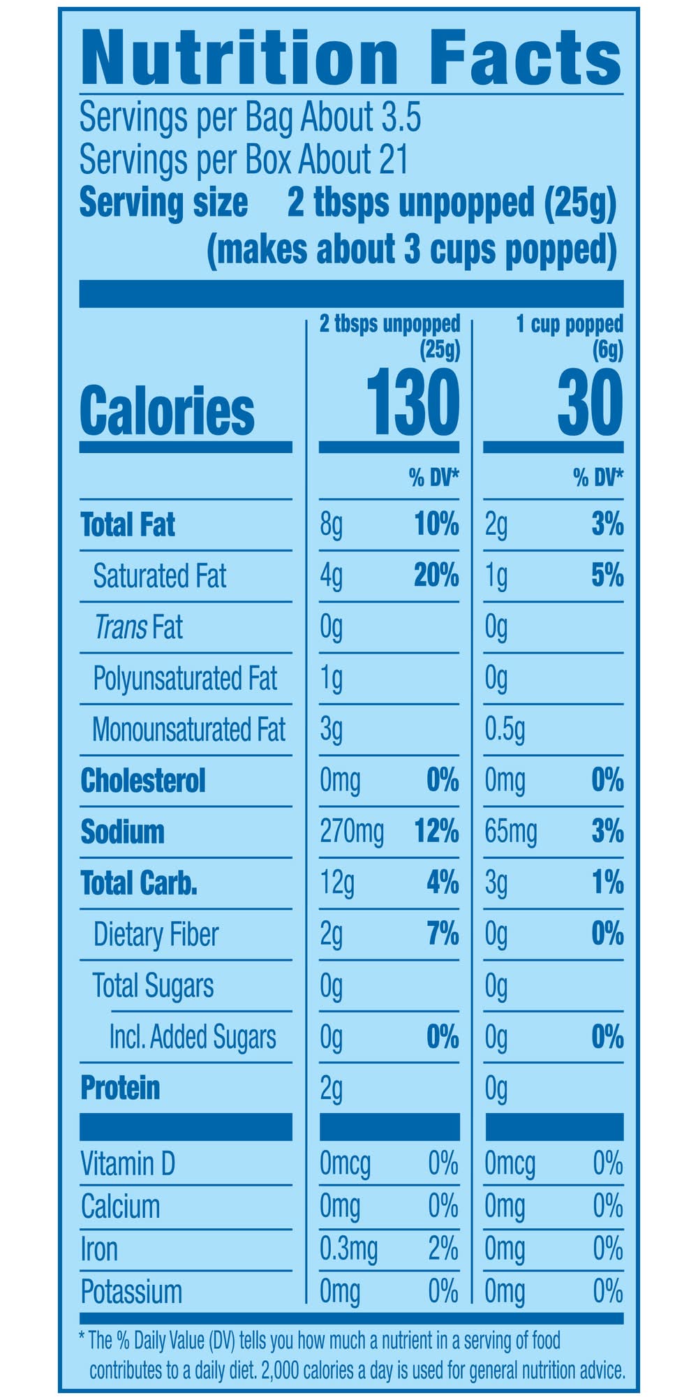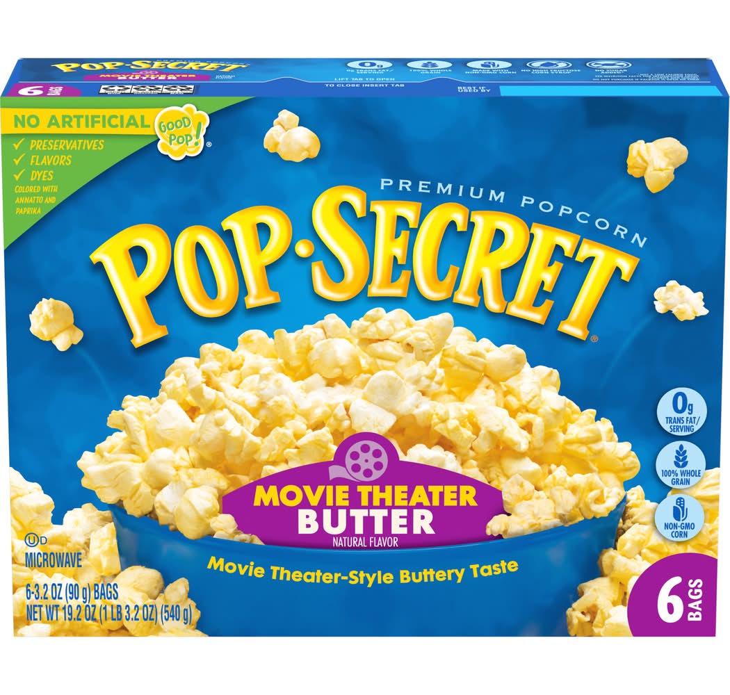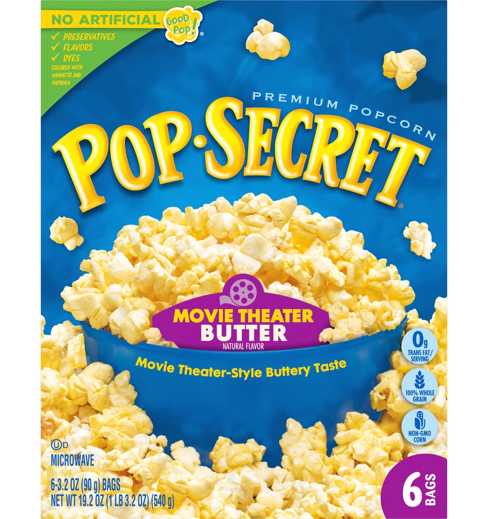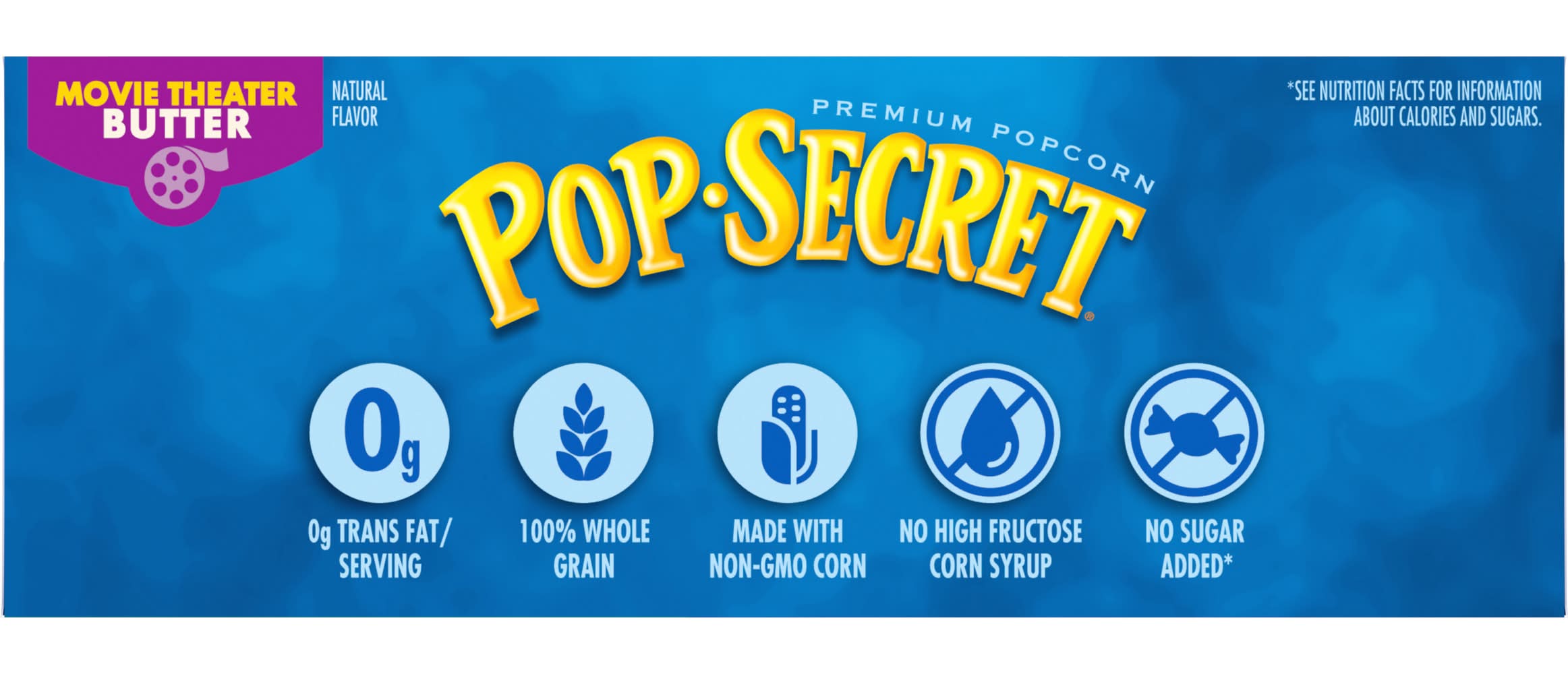 Pop Secret Movie Theater Butter Flavor is your secret to movie night. With a classically rich buttery flavor and airy crunch, this craveable popcorn makes home movie night feel like you’re at the theater, with that familiar aroma and rich flavor. Our microwaveable popcorn is ready in minutes, so it’s easy to serve up hot popcorn to family and friends. And with more than 3 servings, these popcorn bags are perfect for sharing, or pouring straight into a bowl. Made with non-GMO kernels, and no artificial preservatives or flavors, everyone can feel good about popping a handful of snack-time fun. Keep this handy 6-count box of Pop Secret Movie Theater Butter Flavor microwave popcorn bags in your pantry for whenever you need an easy snack for movie night, game time, or any time at all. Since 1985, Pop Secret has been serving up warm, buttery-tasting, craveable popcorn snacks that bring everyone together. It’s the secret that’s too good to keep to yourself. • Flavor: Movie theater butter • Pack size: 6 • Snyder's-lance, inc., Charlotte, NC, 28277-2706 • Packaging: Reusable