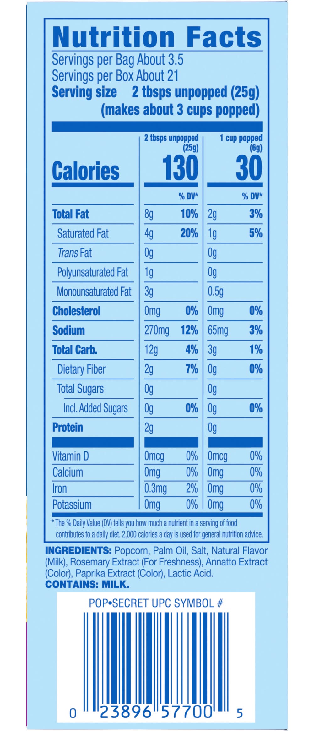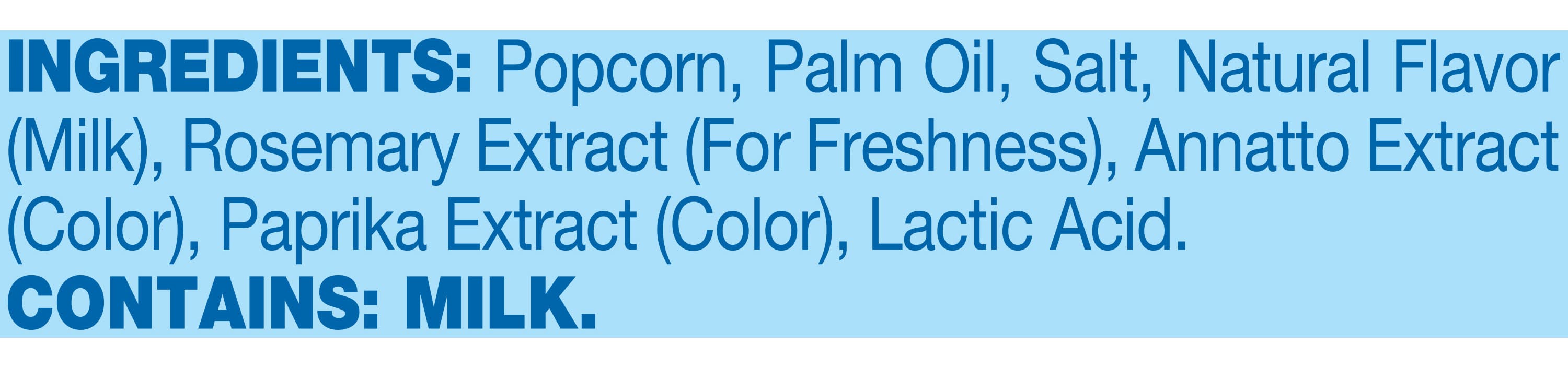 Ingredients: INGREDIENTS: POPCORN, PALM OIL, SALT, NATURAL FLAVOR (MILK), ROSEMARY EXTRACT (FOR FRESHNESS), ANNATTO EXTRACT (COLOR), PAPRIKA EXTRACT (COLOR), LACTIC ACID. CONTAINS: MILK Contains: Dairy, Lactose, Milk