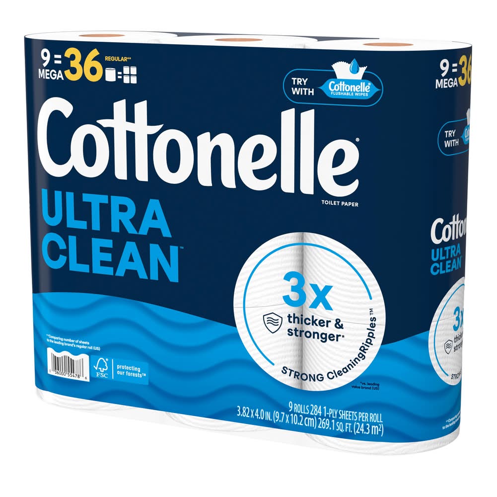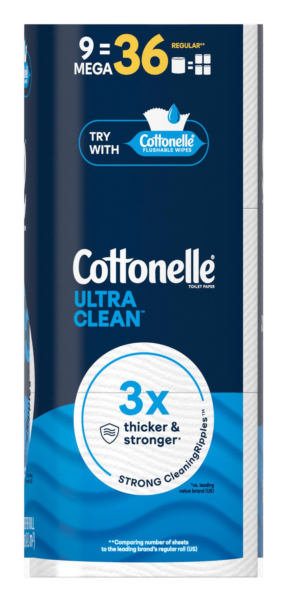 With Cottonelle Ultra Clean Toilet Paper, cleanliness meets quality. Cottonelle Ultra Clean toilet paper rolls feature strong CleaningRipples that remove more in just one wipe and clean better than the leading US value brand. In fact, our toilet paper removes residue, reduces odor, and is safe for sensitive skin. Plus, Cottonelle Ultra Clean Bath Tissue is 3x thicker and stronger*. Each Cottonelle 1-Ply Mega XL Roll lasts more than 5x longer than the leading brand’s regular rolls and comes with 284 sheets per roll. For more ways to feel clean, pair Cottonelle toilet paper with Cottonelle flushable wet wipes to remove up to 100% of residue and odor**. Keep Cottonelle stocked and order online with delivery. (*vs. the leading US value brand) (**using wet + dry vs. dry alone) WHAT'S INCLUDED — This toilet paper pack includes 9 Mega Rolls of Cottonelle Ultra Clean 1-Ply Toilet Paper with 284 sheets per roll (269.10 square feet total), packaging may vary REMOVES MORE IN ONE WIPE* — Our bath tissue removes residue, reduces odor, and is designed for sensitive skin so you can have one less thing to worry about (*vs. the leading US value brand) STRONG TOILET PAPER — Enjoy toilet tissue that is 3x thicker and stronger than the leading US value brand OUR BEST ULTRA CLEAN — Each toilet paper roll features our strong CleaningRipples design to help you feel a complete clean LASTS LONGER — Cottonelle mega rolls last more than 5x longer than the leading brand's regular rolls so you’ll always have enough for you and your family TRY WITH FLUSHABLE WIPES — For an exceptionally easy and thorough clean, pair Ultra Clean toilet paper with Fresh Care flushable wipes SEPTIC-SAFE — This toilet tissue isn’t just strong. Ultra Clean is also septic-safe, sewer-safe, and clog-safe, so you can flush with confidence • Size: 3.82x4.0 in • Packaging: Reusable