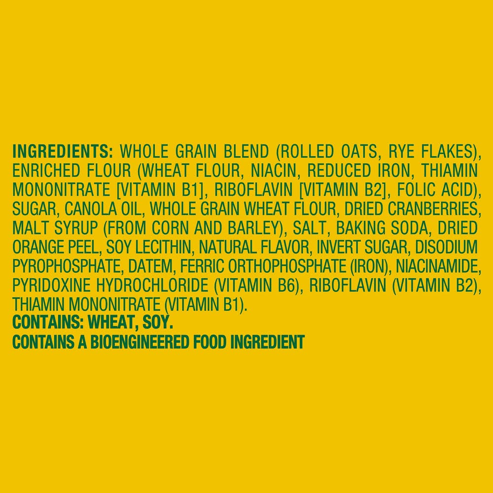 Ingredients: Whole Grain Blend (Rolled Oats, Rye Flakes), Enriched Flour (Wheat Flour, Niacin, Reduced Iron, Thiamin Mononitrate [Vitamin B1], Riboflavin [Vitamin B2], Folic Acid), Sugar, Canola Oil, Whole Grain Wheat Flour, Dried Cranberries, Malt Syrup (From Corn and Barley), Salt, Baking Soda, Dried Orange Peel, Soy Lecithin, Natural Flavor, Invert Sugar, Disodium Pyrophosphate, DATEM, Ferric Orthophosphate (Iron), Niacinamide, Pyridoxine Hydrochloride (Vitamin B6), Riboflavin (Vitamin B2), Thiamin Mononitrate (Vitamin B1) Contains: Wheat, Soy