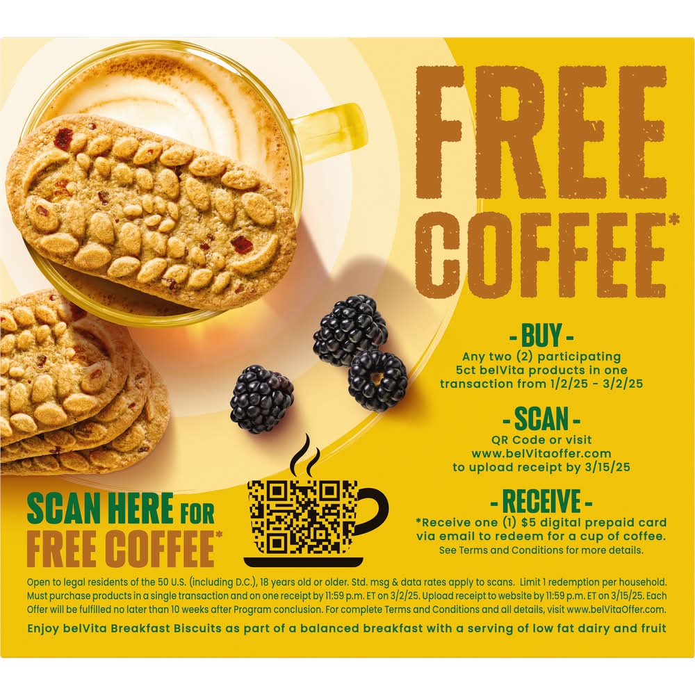 Start your morning off right with lightly sweet and crunchy belVita Cranberry Orange Breakfast Biscuits. These breakfast biscuits combine wholesome grains with cranberry orange flavor for a delicious breakfast. Specially baked, these biscuits contain slow-release carbs that break down gradually in the body to deliver delicious, steady energy all morning long so you can enjoy these with your morning coffee, yogurt and fruit or as an instant breakfast food no matter what the morning brings. Each 50 gram serving of these breakfast cookies contains 18 grams of whole grain, 2 grams of fiber and B vitamins for a delicious alternative to breakfast bars. A simple addition to your morning, these cholesterol-free cranberry orange cookies contain no high-fructose corn syrup and no artificial colors, flavors or sweeteners. What are you waiting for? These convenient breakfast biscuits made with wholesome grains are a great alternative to traditional breakfast snacks. These breakfast biscuits are also energizing alternatives to snack bars and wholesome additions to college care packages. Each individual pack contains four belVita Cranberry Orange Breakfast Biscuits for you to enjoy on the go, at the office or at home for lasting morning energy. • Flavor: Cranberry-orange • Mondelez global llc, Hanover,NJ.