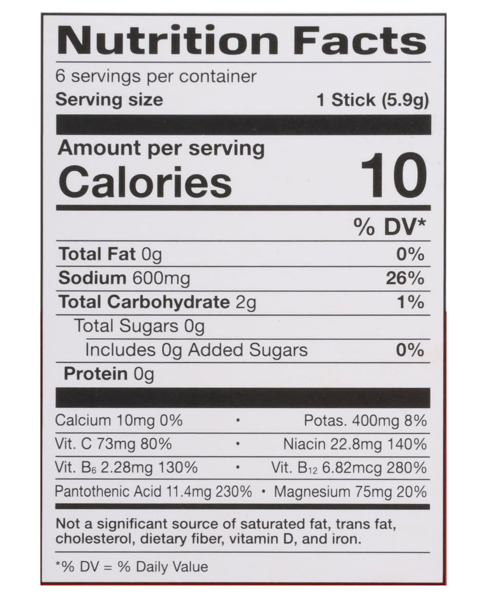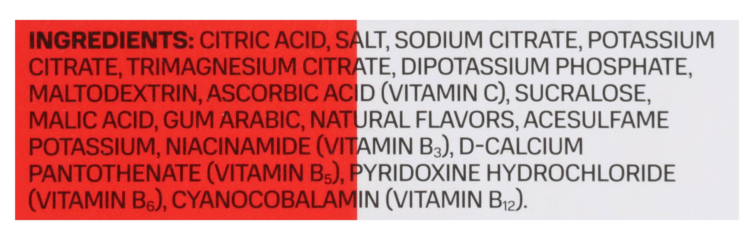 Ingredients: Citric Acid, Salt, Sodium Citrate, Potassium Citrate, Trimagnesium Citrate, Dipotassium Phosphate, Maltodextrin, Ascorbic Acid (Vitamin C), Sucralose, Malic Acid, Gum Arabic, Natural Flavors, Acesulfame Potassium, Niacinamide (Vitamin B3), D-Calcium Pantothenate (Vitamin B5), Pyridoxine Hydrochloride (Vitamin Bg), Cyanocobalamin (Vitamin B12)