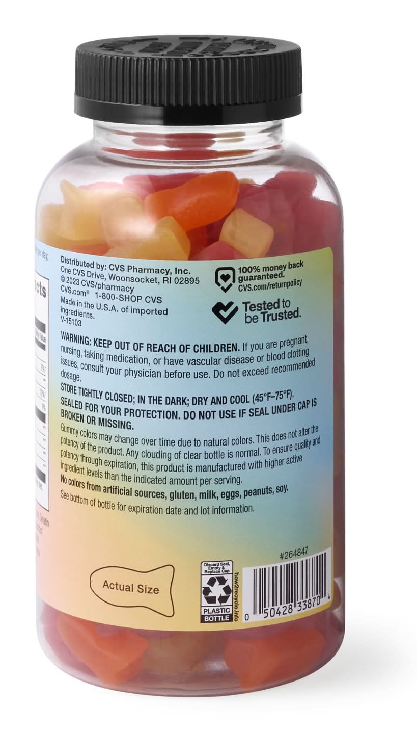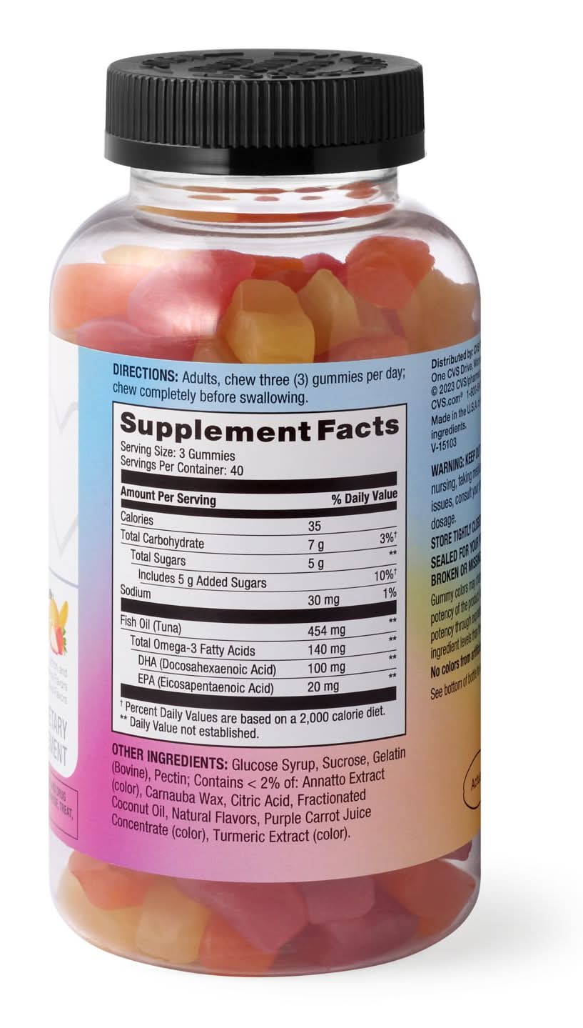 This dietary supplement has no fishy aftertaste, making it pleasant to consume. In fact, it's enhanced with natural fruit flavors and other natural flavors. All the colors come from natural sources, and there are no added artificial preservatives. Gummy colors may change over time due to these natural colors. This does not alter the potency of the product. Any clouding of clear bottle is normal. TESTED TO BE TRUSTED We require that all vitamins & supplements are third-party tested to help ensure they contain the listed dietary ingredients. To learn more, please visit cvs.com/tested-trusted. This item is part of our Tested to be Trusted program As our commitment to you and your family, we require third-party laboratory testing of all vitamins and supplements A product sample is tested for certain contaminants and, whenever possible, the identity and potency of dietary ingredients Our suppliers are required to manufacture products in facilities that are registered with the FDA. Dietary Supplement with no fishy aftertaste Natural fruit flavors with other natural flavors Colors from Natural Sources No Added Artificial Preservatives Does Not Contain Wheat (gluten), Milk, Eggs, Tree Nuts, Peanuts, Soy