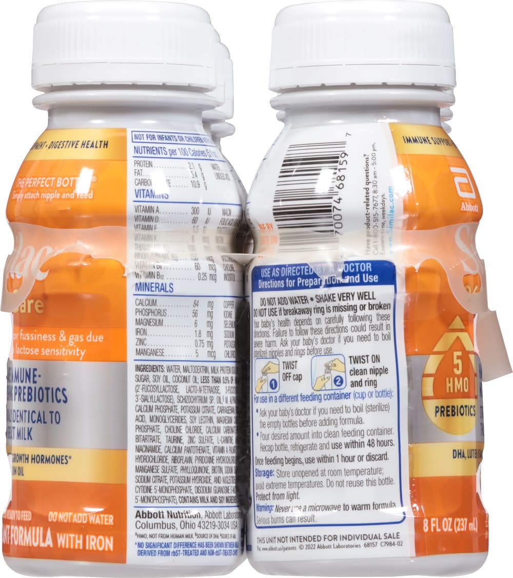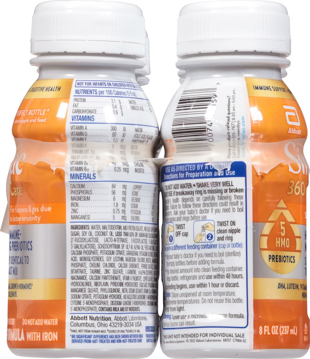 Similac 360 Total Care Sensitive infant formula is gentle nutrition designed to ease common tummy troubles like fussiness and gas due to lactose sensitivity. Our infant formula is designed to help support the immune system, brain development, and digestive health. Similac is the #1 brand fed in hospitals. Ingredients in Similac 360 Total Care Sensitive have no artificial growth hormones† and are non-GMO. Not for infants or children with galactosemia. Milk ingredients are derived from milk of non-rbST-treated cows, which is not different from milk of rbST treated cows. Ingredients not genetically engineered. • Pack size: 6 • Packaging: Reusable
