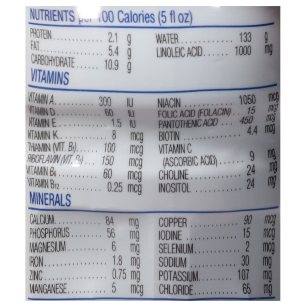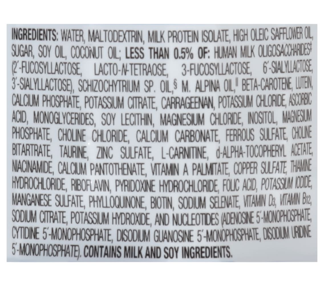 Ingredients: Water, Maltodextrin, Milk Protein Isolate, High Oleic Safflower Ol, Sugar, Soy Oil, Coconut Oil; Less than 0.5% of: Human Milk Oligosacchardes (a) (2-Fucosyllactose, Lacto-Ntetraose, 3-Fucosyllactose, 6'-Sialyllactose, 3-Sialyllactose), Schizochytrium SP, Oil (b), M. Alpina Oil, (c) Beta-Carotene, Lutein, Calcium Phosphate, Potassium Citrate, Carrageenan, Potassium Chloride, Ascorbic Acid, Monoglycerides, Soy Lecithin, Magnesium Chloride, Inositol, Magnesium Phosphate, Choline Chloride, Calcium Carbonate, Ferrous Sulfate, Choline Bitartrate, Taurine, Zinc Sulfate, L-Carnitine, D-Alpha-Tocopheryl Acetate, Niacinamide, Calcium Pantothenate, Vitamin A Palmitate, Copper Sulfate, Thiamine Hydrochloride, Riboflavin, Pyridoxine Hydrochloride, Folic Acid, Potassium Iodide, Manganese Sulfate, Phylloquinone, Biotin, Sodium Selenate, Vitamin Da, Vitamin B12, Sodium Citrate, Potassium Hydroxide, and Nucleotides (Adenosine 5-Monophosphate, Cytidine 5'-Monophosphate, Disodium Guanosine 5'-Monophosphate, Disodium Uridine 5-Monophosphate). (a) HMO, Not from Human Milk. (b) Source of DHA. (c) Source of ARA Contains: Lactose, Milk, Soybeans