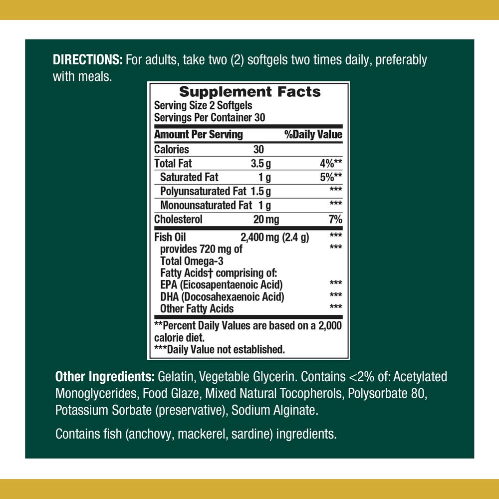 Ingredients: Fish Oil 2, 400 mg (2.4 g) provides 720 mg of Total Omega-3 Fatty Acids† comprising of: EPA (Eicosapentaenoic Acid), DHA (Docosahexaenoic Acid), Other Fatty Acids Contains: fish