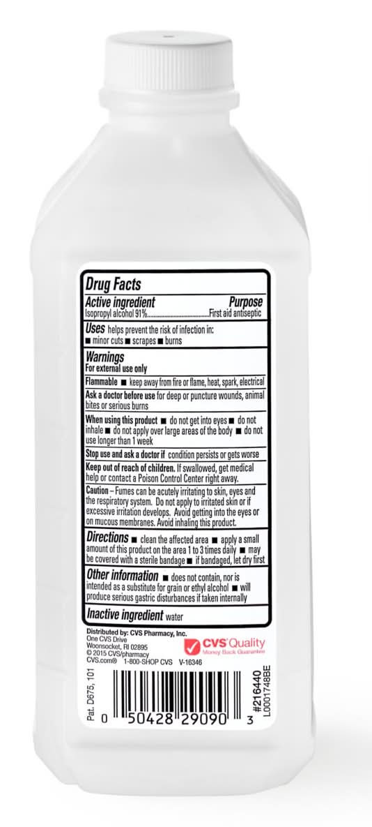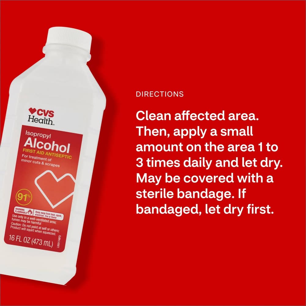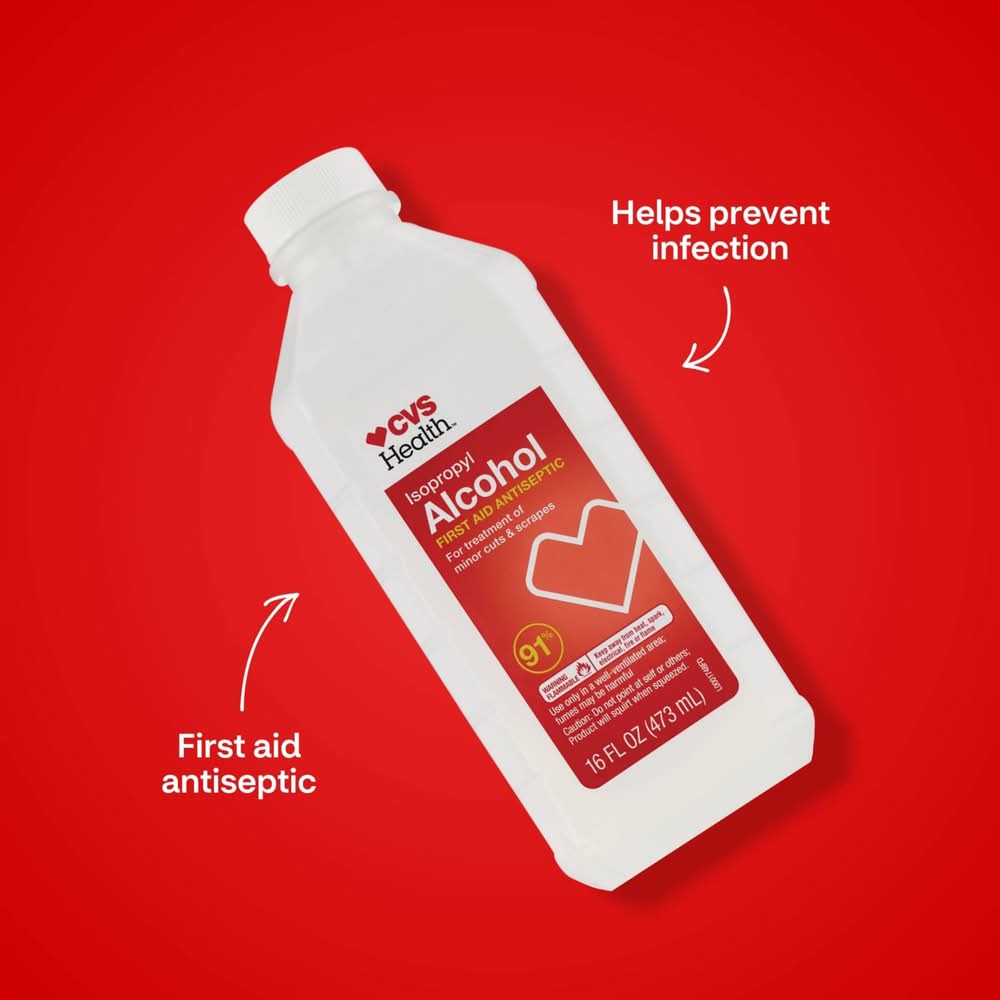 CVS Health alcohol is the isopropyl-based liquid you know most commonly as a first aid antiseptic. With a 91% isopropyl base, this alcohol may be used as a topical antiseptic to help reduce the risk of infections that could come from even minor lacerations, scrapes or burns. This rubbing alcohol can hold an important place in your at-home first-aid care kit. HSA/FSA eligible For minor lacerations, scrapes or burns May be used as a topical antiseptic This item cannot be shipped to the following locations: AA, AE, AK, AP, GU, PR and VI