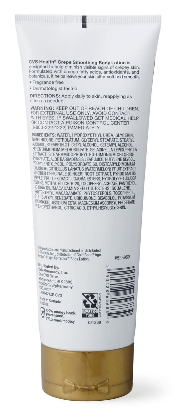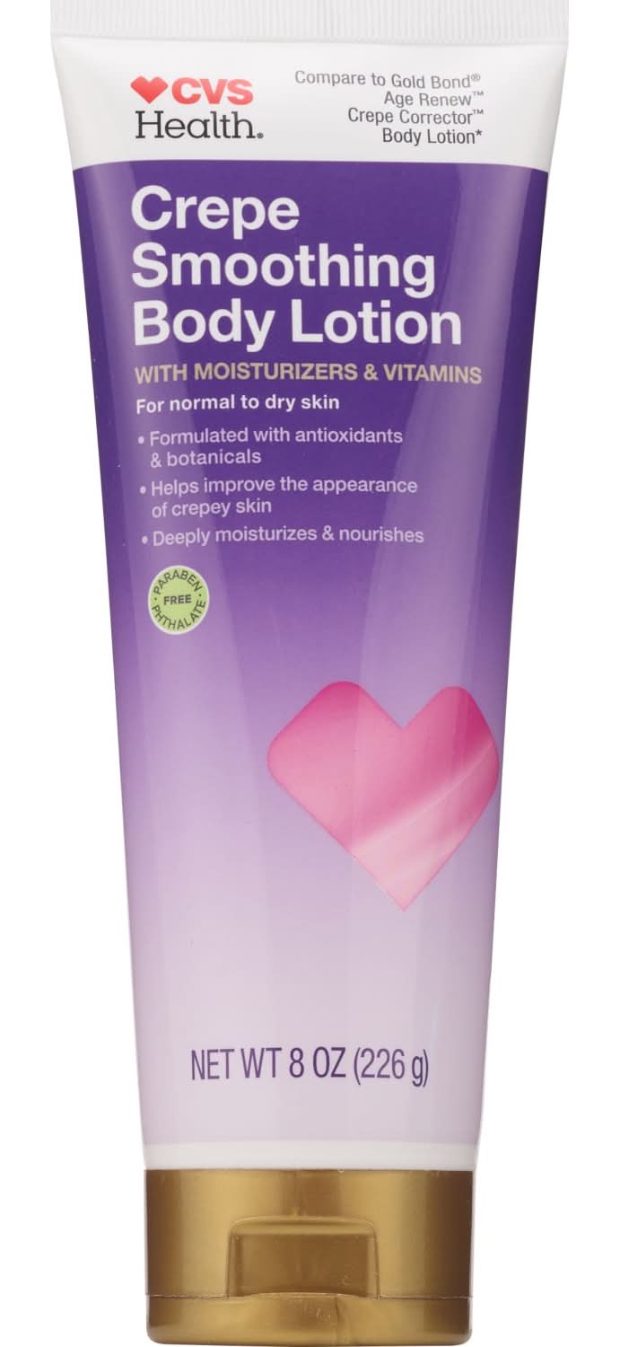 Compare to Gold Bond® Age Renew™ Crepe Corrector™ Body Lotion*CVS Health® Crepe Smoothing Body Lotion is designed to help diminish visible signs of crepey skin. Formulated with omega fatty acids, antioxidants, and botanicals, it helps leave your skin ultra-soft and smooth.*This product is not manufactured or distributed by Chattem, Inc., distributor of Gold Bond® Age Renew™ Crepe Corrector™ Body Lotion. Formulated with antioxidants & botanicals Helps improve the appearance of crepey skin Deeply moisturizes & nourishes Fragrance free Dermatologist tested