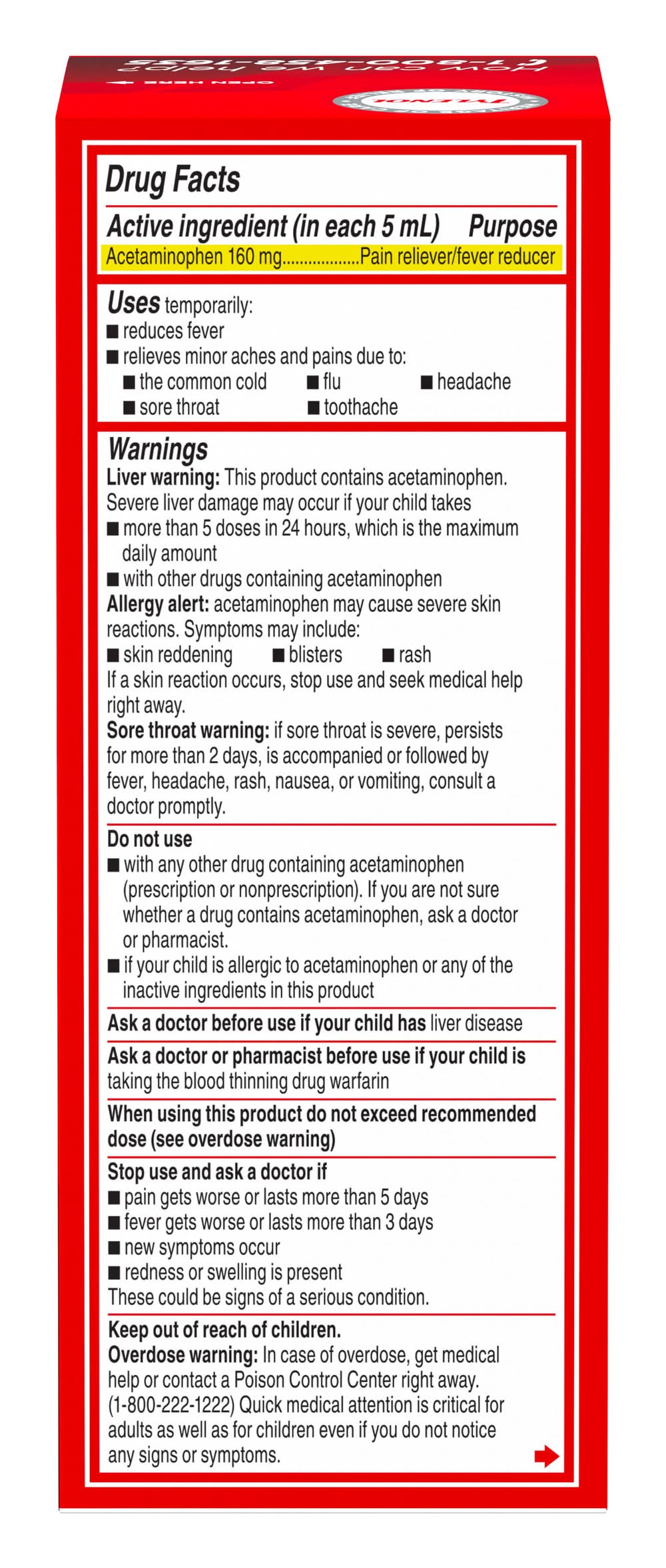 Ingredients: Active ingredient (in each 5 mL) Acetaminophen 160 mg Purpose Pain reliever/fever reducer Inactive ingredients anhydrous citric acid, flavors, glycerin, microcrystalline cellulose and carboxymethylcellulose sodium, potassium sorbate, purified water, sodium benzoate, sodium citrate, sorbitol solution, sucralose, sucrose, xanthan gum