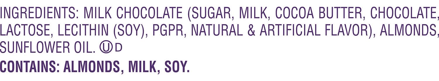 Ingredients: Milk Chocolate (Sugar, Milk, Cocoa Butter, Chocolate, Lactose, Lecithin (Soy), PGPR, Natural & Artificial Flavor), Almonds, Sunflower Oil Contains: Milk, Tree Nuts, Almonds, Lactose, Soybeans