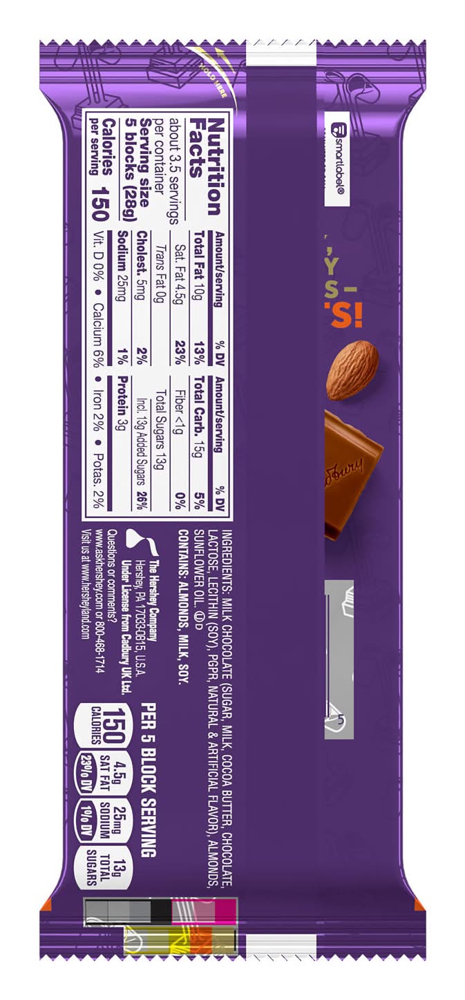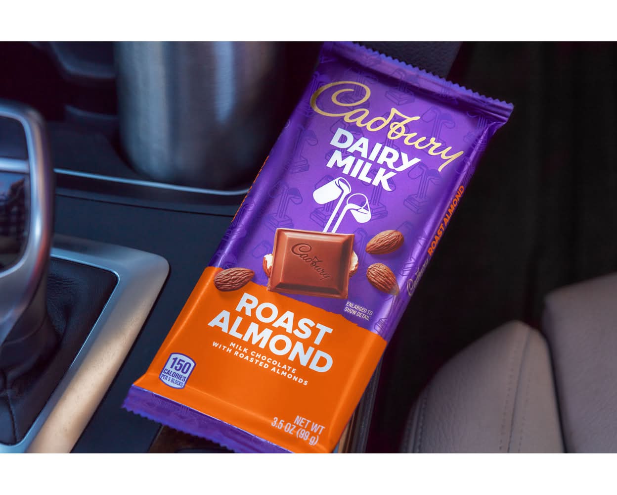 Velvety smooth milk chocolate accompanied by the crunch of delicious roasted almonds? What a delight! CADBURY DAIRY MILK chocolate bars are the snack you reach for when you want to treat yourself to a deliciously smooth yet crunchy treat. Take a moment to enjoy a few pieces straight out of the wrapper when you need a break. With this milk chocolate almond bar, you can even think about adding a nutty touch to your baking prep! Carefully melt the CADBURY chocolate bar, then dip, dunk, drizzle and swirl it over sweet and salty snacks, including pretzels, fruit, marshmallows, assorted nuts and just about every other treat you can think of. Take a large almond and milk chocolate bar to work for a midday treat with your co-workers, or add some to gift baskets to share the timeless taste of milk chocolate packed with roasted almonds. These candies also make unique chocolate gifts during Valentine's Day, basket fillers at Easter, stocking stuffers throughout the holidays and Halloween treats during trick-or-treat season. Get ready to please the crowd whether you're celebrating a holiday or just enjoying an ordinary sharing moment with CADBURY DAIRY MILK Roast Almond chocolate candy you'll swear tastes better with every bite. The Hershey Company, Hershey,PA,17033-0815
