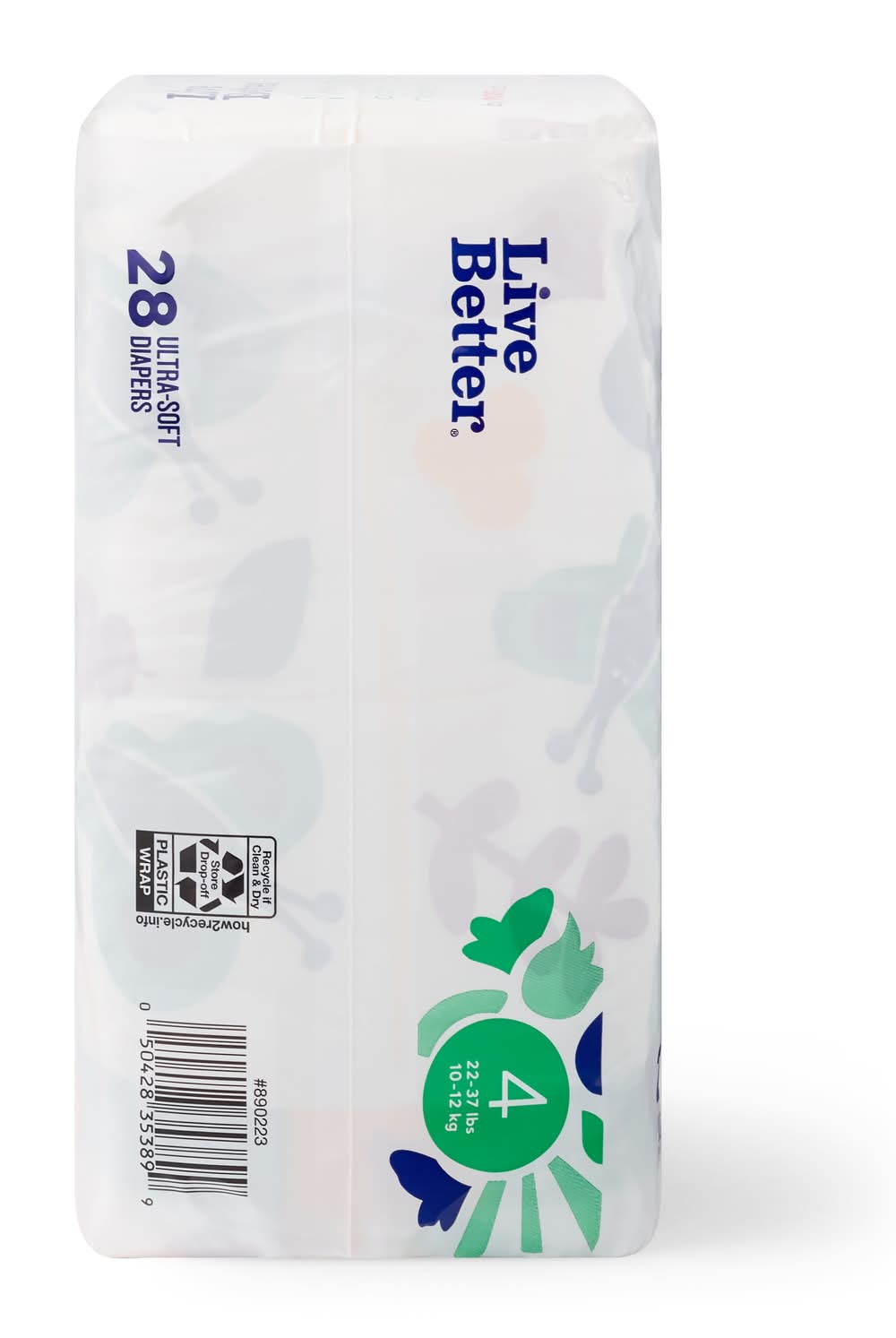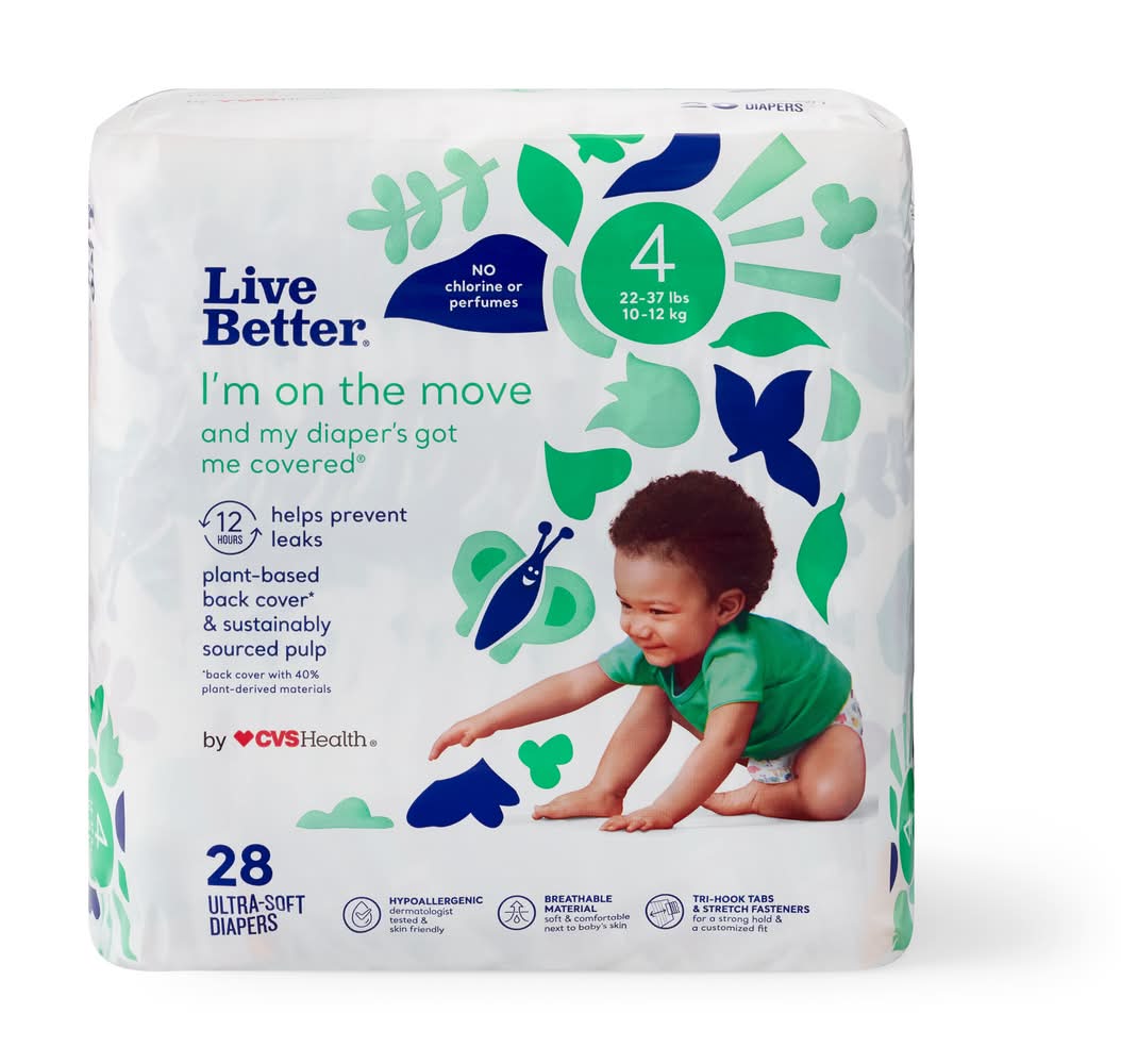 We are in the process of transitioning our packaging. Either package may arrive. Live Better by CVS Health brings you trusted and transparent wellness solutions. Our Live Better ultra-soft baby diapers help prevent leaks for 12 hours. Each diaper is made with breathable material, that is soft & comfortable next to your babys skin. The comfort stretch leg cuffs provide a secure fit that helps prevent leaks while the tri-hook tabs & stretch fasteners create a strong hold & customized fit. Each diaper also comes equipped with indicators to help you care for your baby; the wetness indicator changes color when wet and the Smart Fit indicator helps you know when your baby is ready for the next size. Filled with purpose and consciously selected, our products help you stay well and simply live better. The Live Better diaper has sustainably sourced pulp and a plant-based back cover made with 40% plant-derived materials. Each diaper is free from perfumes, rubber latex, and lotions and no chlorine is used in the manufacturing of this diaper. Dermatologist tested and hypoallergenic, Live Better baby diapers are a skin friendly choice for your little love bug. Product Features: Ultra-soft diapers Helps prevent leaks 12 hours Dermatologist tested and hypoallergenic Free from perfumes, rubber latex, and lotions Skin friendly No chlorine or perfumes Plant-based back cover* and sustainably sourced pulp o *back cover with 40% plant-derived materials Breathable material: soft & comfortable next to baby’s skin Tri-hook tabs & stretch fasteners, for a strong hold & customized fit Stretch fasteners help provide a customized fit & powerful leakage protection Tri-hook tabs provide 3 grip edges for a strong hold Comfort stretch leg cuffs provide a secure fit that helps prevent leaks Wetness Indicator changes color when wet Smart Fit Indicator helps you know when your baby is ready for the next size Size: Size 4