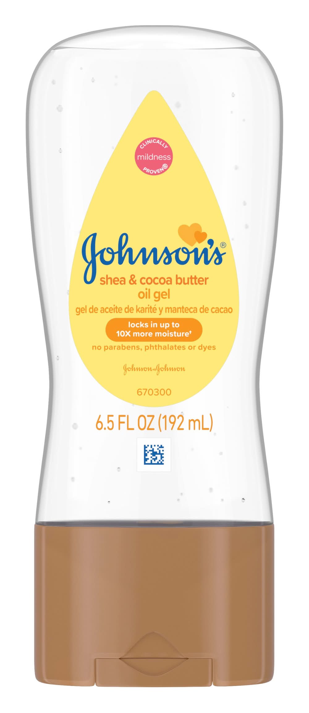 Oil Gel is a clinically proven formula designed to lock in up to 10 times more moisture on wet skin compared to an ordinary lotion on dry skin. It's enriched with shea and cocoa butter to help relieve dryness and is suitable for both children and adults. This hypoallergenic product has been tested by dermatologists and is free from parabens, phthalates, and dyes. • Johnson & Johnson Consumer Inc., Skillman, NJ, 08558 • Packaging: Reusable
