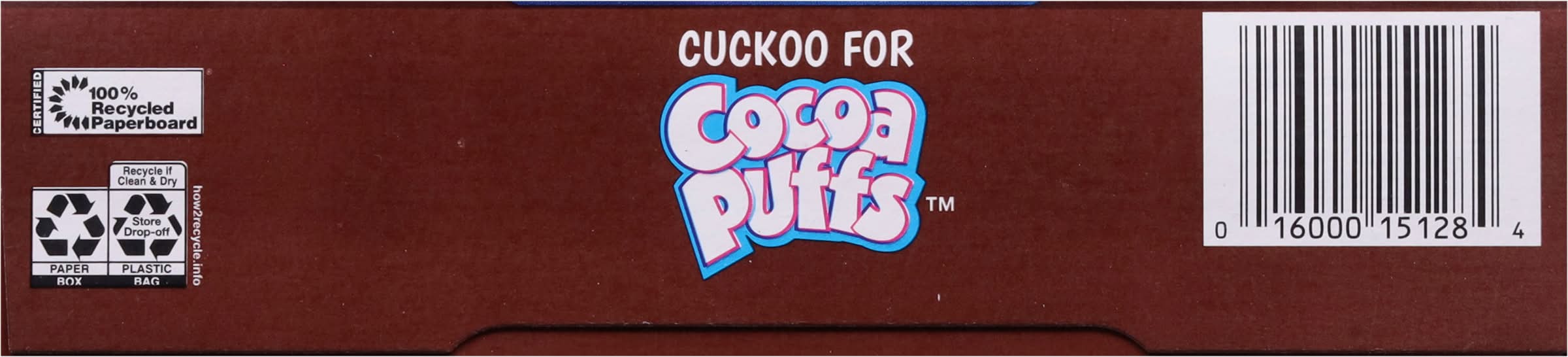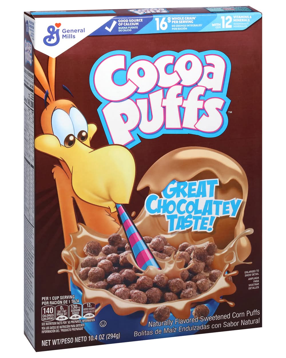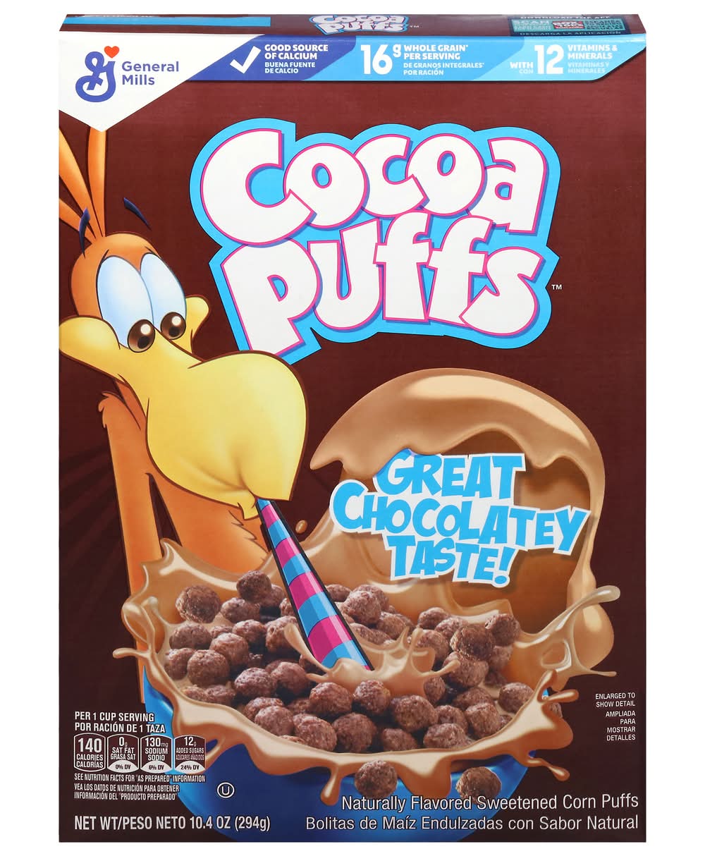 Your family will go cuckoo for the deliciously chocolatey taste of Cocoa Puffs Cereal! Cocoa Puffs are naturally flavored sweetened corn puffs bursting with the chocolatey taste kids love. Each yummy serving provides 16g whole grain (at least 48g recommended daily), and has a good source of calcium, with 12 vitamins and minerals. When Cocoa Puffs splash down into your bowl, they turn the cereal milk into a slurp-a-licious chocolatey treat. The rich taste of this chocolatey cereal is the perfect addition to a kids breakfast or an after school snack. Use a handful as an ice cream topping. Sprinkle Cocoa Puffs into your favorite homemade cereal bars or trail mix recipes. Pour a portion into a take-along bag to snack on the go. However you enjoy the taste, General Mills cereals spread goodness from tots to grown-ups. Contains one cardboard box of crunchy Cocoa Puffs, Chocolatey Breakfast Cereal, Whole Grain; Perfect for instant snacking, or a part of breakfast and meals. • General Mills Sales Inc, Minneapolis, MN 55440 USA • Packaging: Reusable