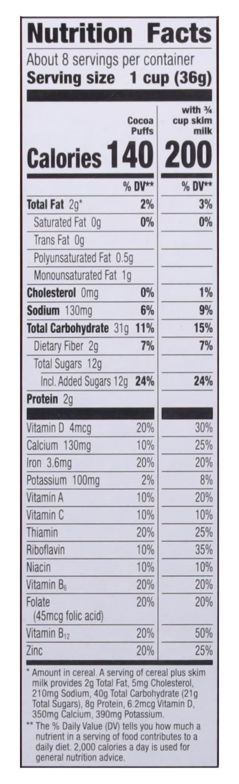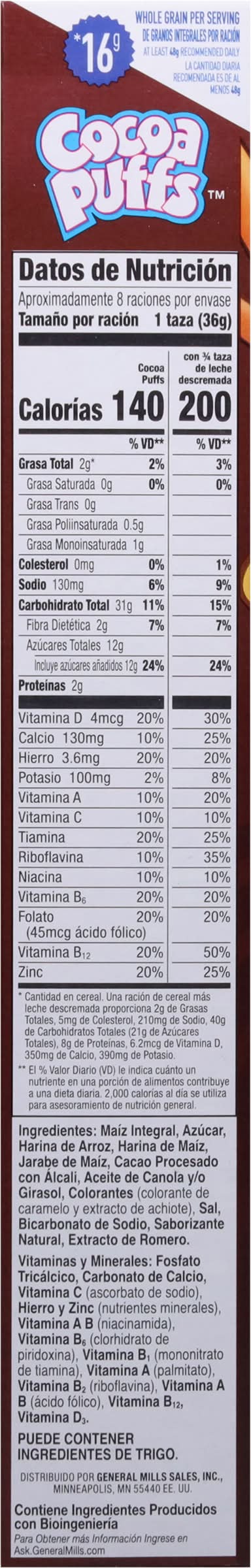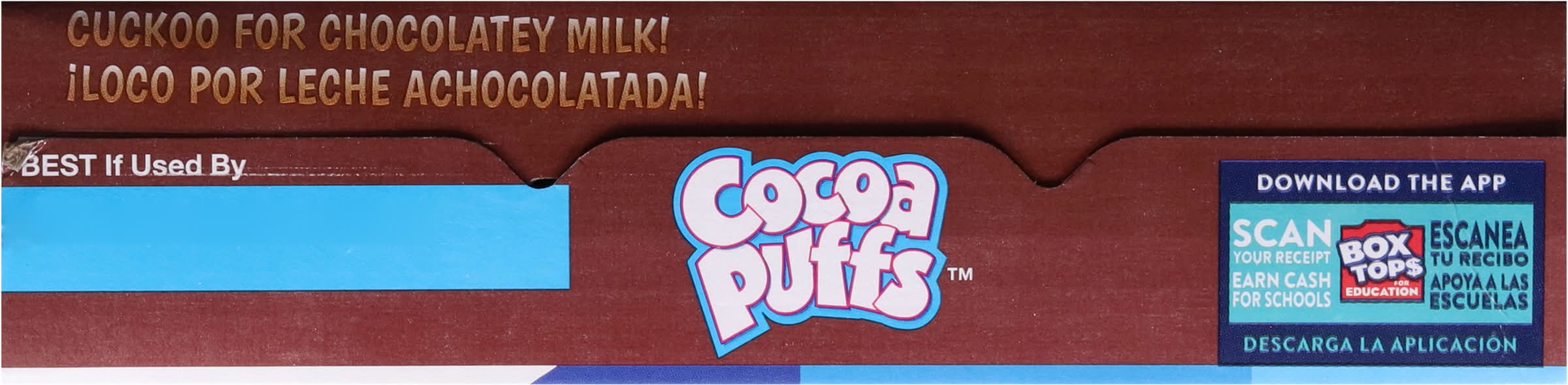 Your family will go cuckoo for the deliciously chocolatey taste of Cocoa Puffs Cereal! Cocoa Puffs are naturally flavored sweetened corn puffs bursting with the chocolatey taste kids love. Each yummy serving provides 16g whole grain (at least 48g recommended daily), and has a good source of calcium, with 12 vitamins and minerals. When Cocoa Puffs splash down into your bowl, they turn the cereal milk into a slurp-a-licious chocolatey treat. The rich taste of this chocolatey cereal is the perfect addition to a kids breakfast or an after school snack. Use a handful as an ice cream topping. Sprinkle Cocoa Puffs into your favorite homemade cereal bars or trail mix recipes. Pour a portion into a take-along bag to snack on the go. However you enjoy the taste, General Mills cereals spread goodness from tots to grown-ups. Contains one cardboard box of crunchy Cocoa Puffs, Chocolatey Breakfast Cereal, Whole Grain; Perfect for instant snacking, or a part of breakfast and meals. • General Mills Sales Inc, Minneapolis, MN 55440 USA • Packaging: Reusable