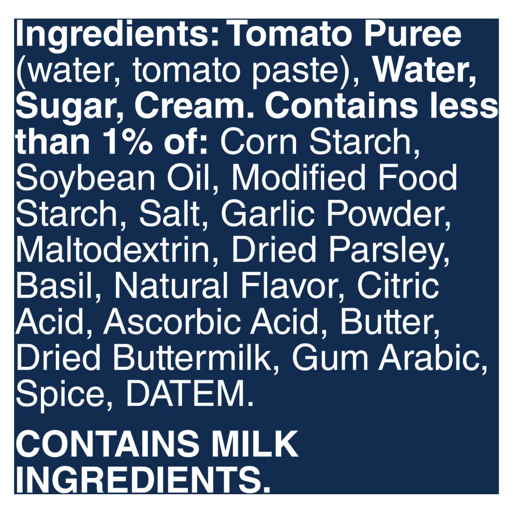 Ingredients: Tomato Puree (Water, Tomato Paste), Water, Sugar, Cream, Contains Less than 1% of: Corn Starch, Soybean Oil, Modified Food Starch, Salt, Garlic Powder, Maltodextrin, Dried Parsley, Basil, Natural Flavor, Citric Acid, Ascorbic Acid, Butter, Dried Buttermilk, Gum Arabic, Spice, DATEM Contains: Milk, Soy