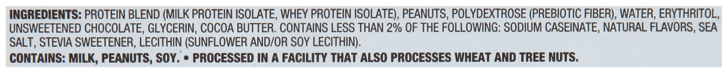 Ingredients: Protein Blend (Milk Protein Isolate, Whey Protein Isolate), Peanuts, Polydextrose (Prebiotic Fiber), Water, Erythritol, Unsweetened Chocolate, Glycerin, Cocoa Butter. Contains Less than 2% of the Following: Sodium Caseinate, Natural Flavors, Sea Salt, Stevia Sweetener, Lecithin (Sunflower and/or Soy Lecithin) Contains: Milk, Peanuts, Soybeans, Wheat, Tree Nuts