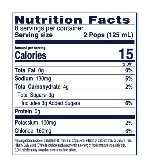 Grape. Blue Raspberry. Cherry. Orange. Natural & artificial flavor. One Liter of Pedialyte Freezer Pops (16 Pops) Provides: sodium, 45 mEq; potassium, 20 mEq; chloride, 35 mEq. Halal. No.1 pharmacist & pediatrician recommended brand for hydration. Electrolyte solution. Replaces electrolytes. Trusted by doctors and hospitals since 1966. Designed for fast, effective rehydration. Pedialyte is designed to prevent dehydration (For mild to moderate dehydration) more effectively than common beverages. Pedialyte quickly replenishes fluids and electrolytes to help prevent dehydration due to: vomiting & diarrhea; heat exhaustion; intense exercise; travel. Use Pedialyte rather than juices, sodas, or sports drinks, which contain too much sugar and can make diarrhea worse. Note: Like colored ices, Pedialyte Freezer Pops may temporarily color mouth. Pack size: 16