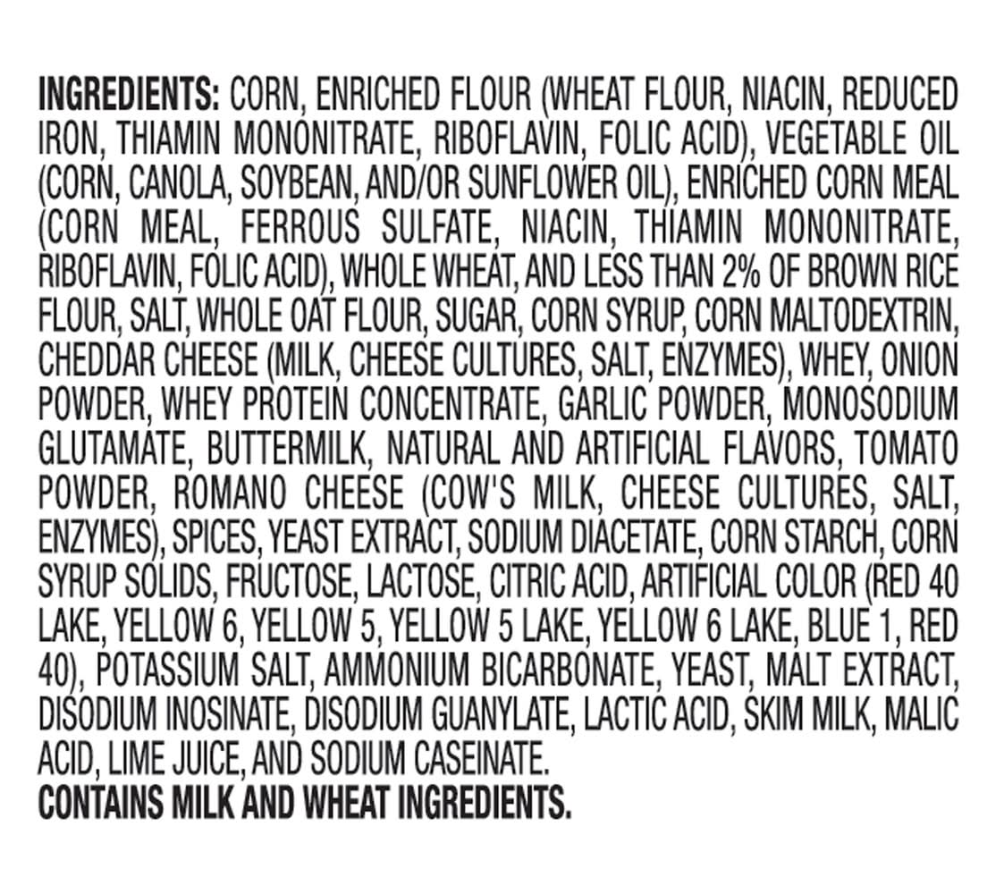 Ingredients: Corn, Vegetable Oil (Corn Canola Soybean and/or Sunflower Oil), Enriched Flour (Wheat Flour Niacin Reduced Iron Thiamin Mononitrate Riboflavin Folic Acid), Enriched Corn Meal (Corn Meal Ferrous Sulfate Niacin Thiamin Mononitrate Riboflavin Folic Acid), Whole Wheat, and Less than 2% of Brown Rice Flour, Salt, Whole Oat Flour, Sugar, Corn Syrup, Maltodextrin (Made from Corn), Cheddar Cheese (Milk Cheese Cultures Salt Enzymes), Onion Powder, Whey, Whey Protein Concentrate, Garlic Powder, Monosodium Glutamate, Buttermilk, Natural and Artificial Flavors, Tomato Powder, Romano Cheese (Cow's Milk Cheese Cultures Salt Enzymes), Spices, Yeast Extract, Sodium Diacetate, Corn Starch, Corn Syrup Solids, Fructose, Lactose, Citric Acid, Artificial Color (Red 40 Lake Yellow 6 Yellow 5 Yellow 5 Lake Yellow 6 Lake Blue 1 Red 40), Potassium Salt, Ammonium Bicarbonate, Yeast, Malt Extract, Disodium Inosinate, Disodium Guanylate, Lactic Acid, Skim Milk, Malic Acid, Lime Juice, and Sodium Caseinate Contains: Milk, Wheat, Oat, Soybeans, Lactose