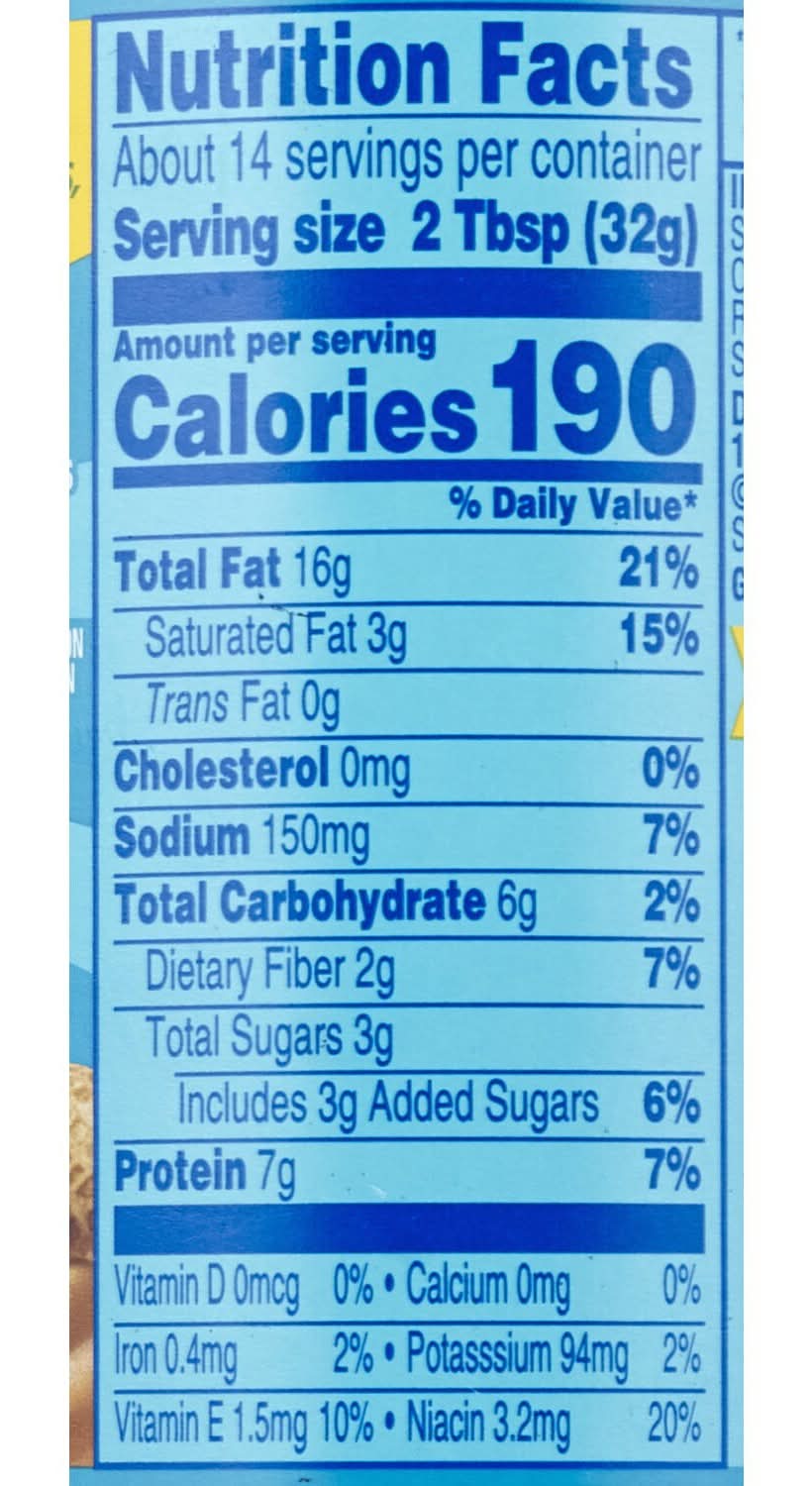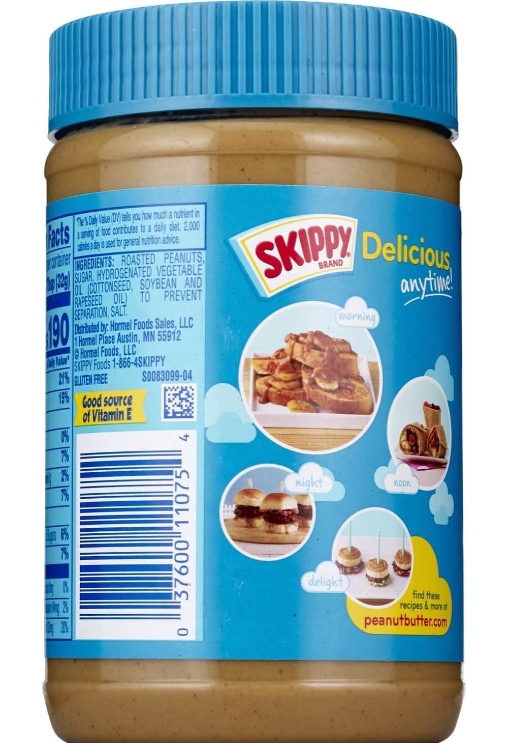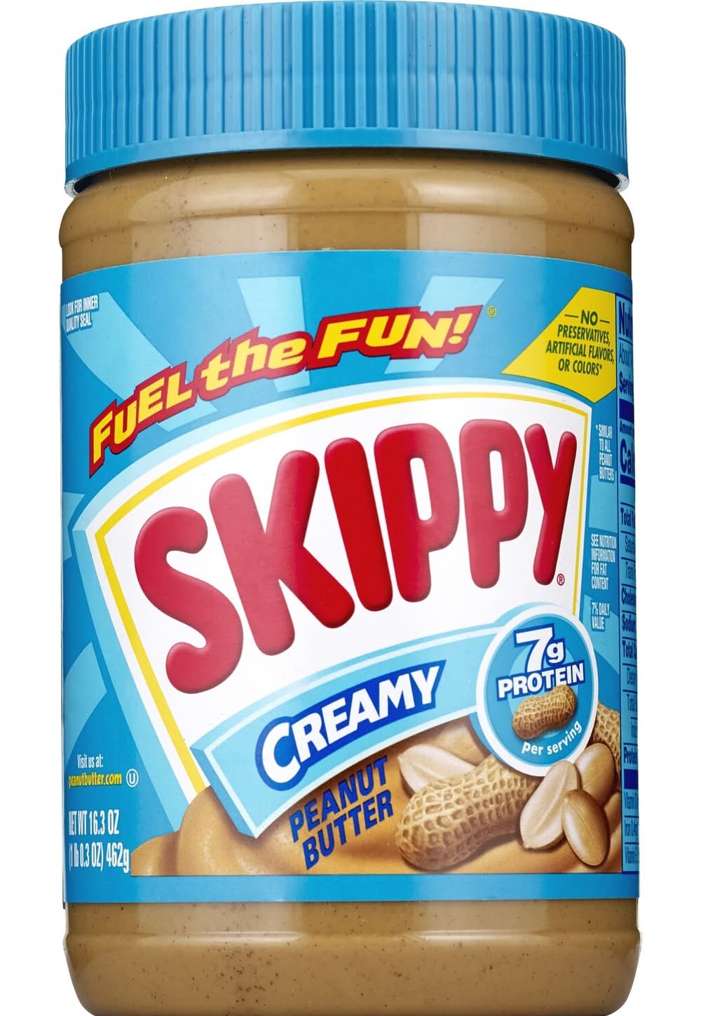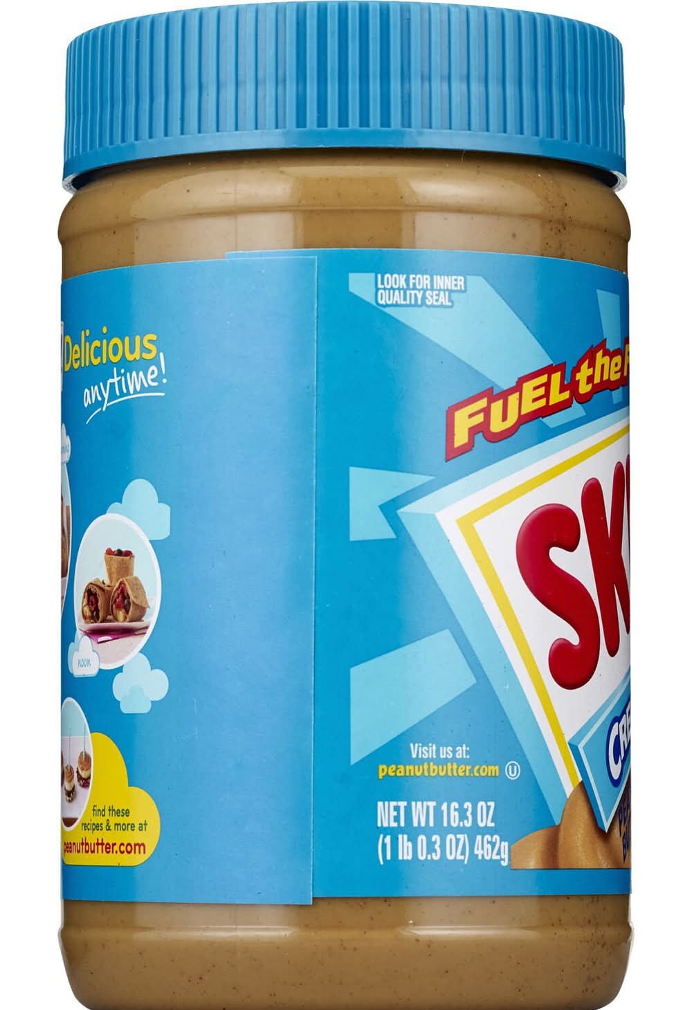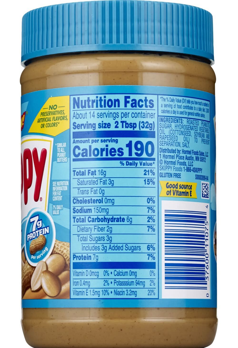 7g Natural protein. As always no trans fat per serving. . Did you Know? Every serving of Skippy Peanut Butter has 7 grams of natural protein to help fuel the fun. So when combined with healthy foods like whole grain bread, fruit & milk, Skippy helps restore your family's energy and leaves them feeling charged! Eat Smart: U.S. Dietary guidelines recommend eating a varied, nutritious diet within your calorie needs. This product is a good source of Vitamin E, is naturally free of cholesterol and contains no trans fat. Contains 16g fat and 3g saturated fat per serving. Packaging: Reusable