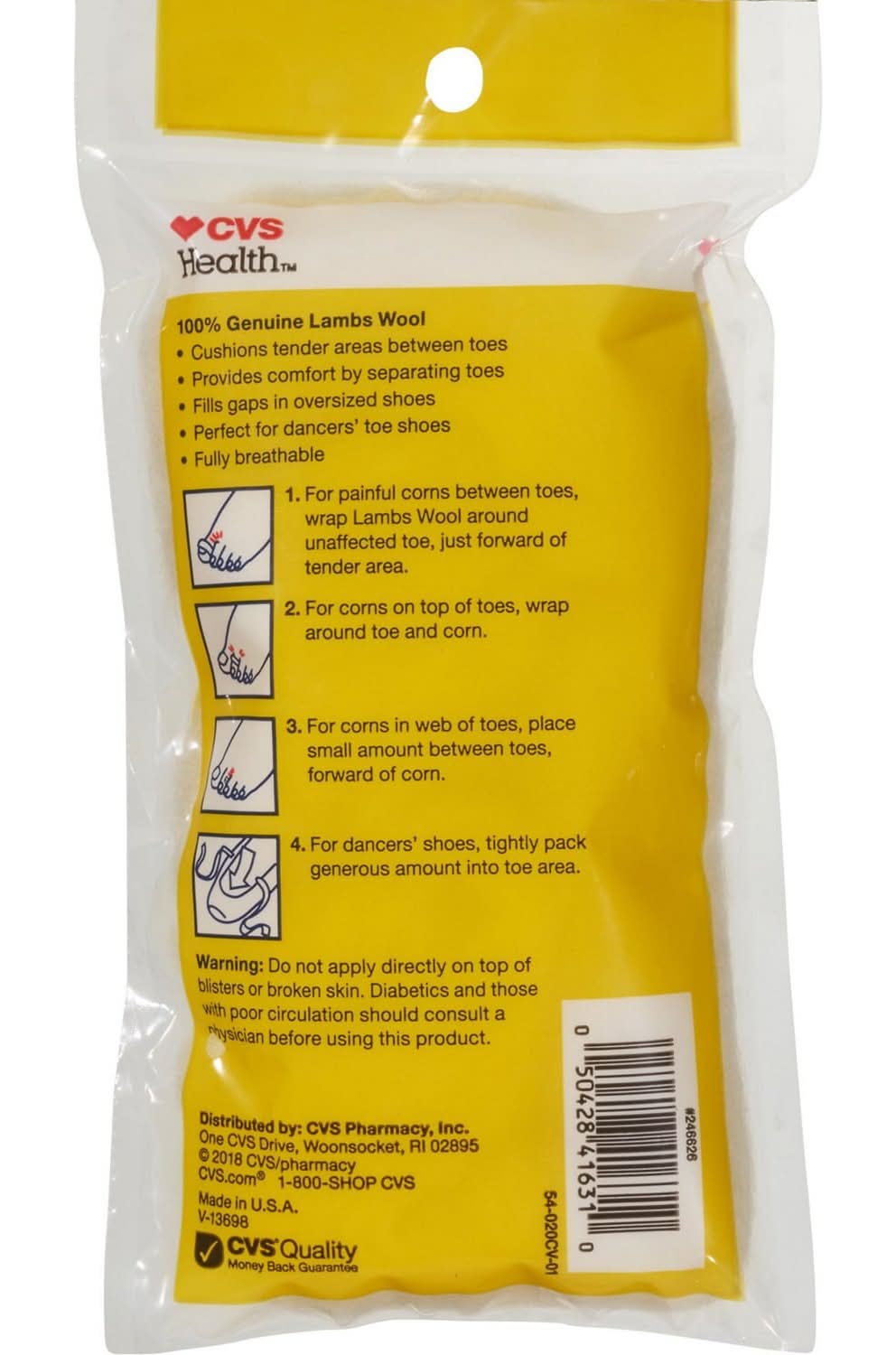 Directions: 1. for painful corns between toes, wrap lambs wool around unaffected toe, just forward of corn. 2. for corns on top of toes, wrap around toe and corn. 3. for corns in web of toes, place small amount between toes, forward of corn. 4. for dancers' shoes, tightly pack generous amount into toe area.