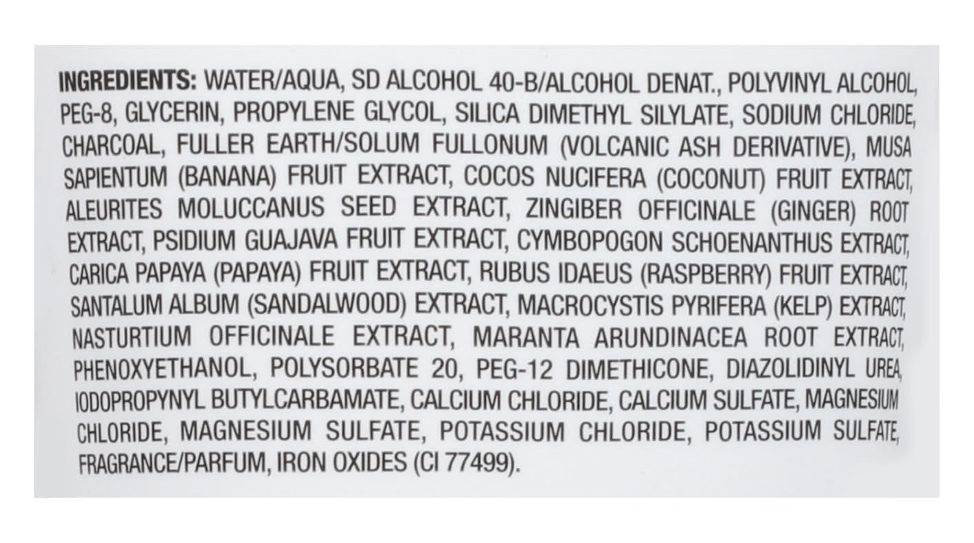 Ingredients: Water/Aqua, SD Alcohol 40-B/Alcohol Denat, Polyvinyl Alcohol, PEG-8, Glycerin, Propylene Glycol, Silica Dimethyl Silylate, Soldium Chloride, Charcoal, Fuller’s Earth/Solum Fullonum (Volcanic Ash Derivative), Musa Sapientum (Banana) Fruit Extract, Cocos Nucifera (Coconut) Fruit Extract, Aleurites Moluccanus Seed Extract, Zingiber Officinale (Ginger) Root Extract, Psidium Guajava Fruit Extract, Cymbopogon Schoenanthus Extract, Carica Papaya (Papaya) Fruit Extract, Rubus Idaeus (Raspberry) Fruit Extract, Santalum Album (Sandalwood) Extract, Macrocystis Pyrifera (Kelp) Extract, Nasturtium Officinale Extract, Maranta Arundinacea Root Extract, Phenoxyethanol, Polysorbate 20, PEG-12 Dimethicone, Diazolidinyl Urea, Iodopropynyl Butylcarbamate, Calcium Chloride, Calcium Sulfate, Magnesium Chloride, Magnesium Sulfate, Potassium Chloride, Potassium Sulfate, Fragrance/Parfum, Iron Oxides (CI 77499) Contains: Tree Nuts, Coconuts