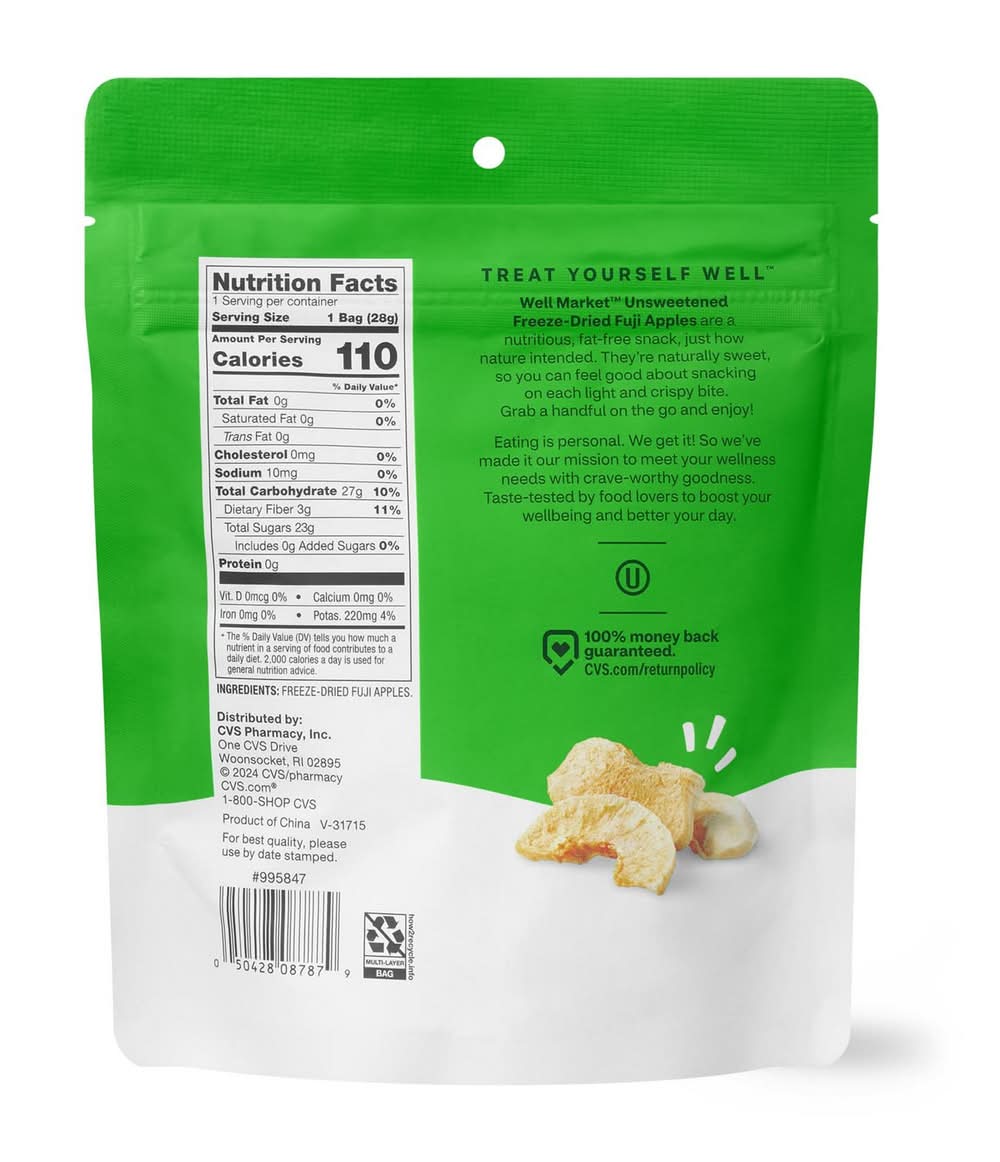 Well Market™ Unsweetened Freeze-Dried Fuji Apples are a nutritious, fat-free snack, just how nature intended. They’re naturally sweet, so you can feel good about snacking on each light and crispy bite. Grab a handful on the go and enjoy! Eating is personal. We get it! So we’ve made it our mission to meet your wellness needs with crave-worthy goodness. Taste-tested by food lovers to boost your wellbeing and better your day. TREAT YOURSELF WELL™. Fuji Apple Gluten-free No added sugar 1 ½ cups of fruit per serving NET WT 1oz. Gold Emblem and Gold Emblem Abound are now Well Market™ 100% money-back guarantee on Our CVS Brands. If you are not 100% satisfied with a CVS Pharmacy private brand product, you can return it for free (some exclusions apply*). For more details regarding Our CVS Brands return policy, please visit https://www.cvs.com/retail/help/return_policy.