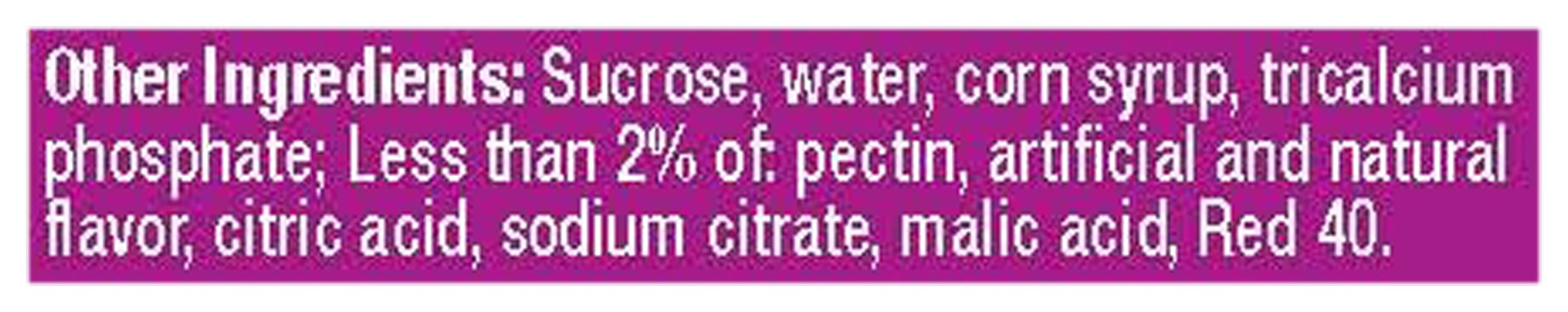 Ingredients: Other Ingredients: Sucrose, Water, Corn Syrup, Tricalcium Phosphate; Less than 2% of Pectin, Artificial and Natural Flavor, Citric Acid, Sodium Citrate, Malic Acid, Red 40 Contains: Corn