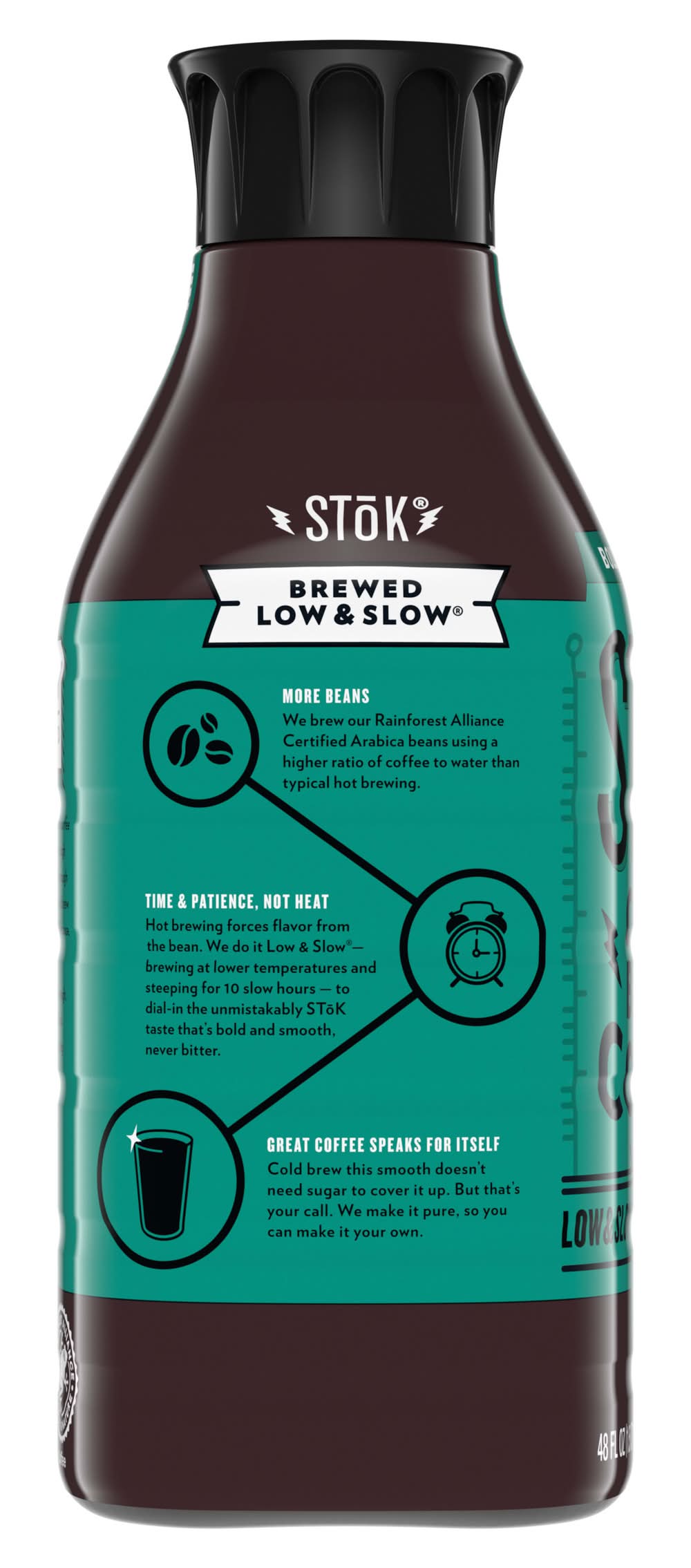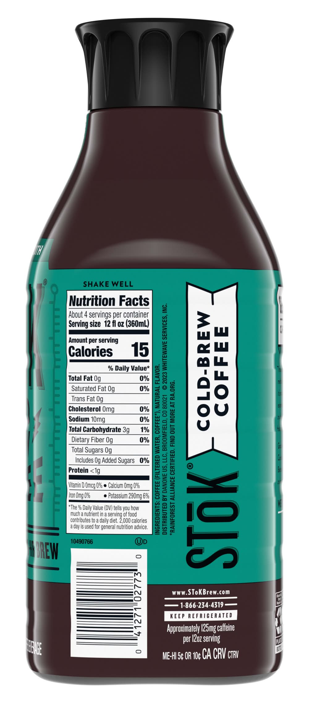 Brewed Low & Slow(TM), SToK Un-Sweet Black Cold Brew Coffee is Bold & Smooth. For those who like their cold brew black and their dreams in color. No cream. You get a medium roast cold brew blend served black and unsweetened. At SToK, we brew our cold brew coffee blend for at least 10 hours for a bold, one-of-a-kind flavor that’s never bitter. SToK Cold Brew Coffee uses a higher ratio of Rainforest Alliance Certified, Arabica-based coffee beans to water than hot brewed coffee. This yields a smooth and flavorful coffee. Looking for the best brew to suit the mood? Check out all the SToK flavors for the perfect fit, with Bright & Mellow as our lightest roast and Espresso Blend as our darkest. Wake up your passions with SToK bottled coffee drinks you can enjoy throughout the day. • Danone US, LLC, Broomfield CO 80021 • Packaging: Reusable
