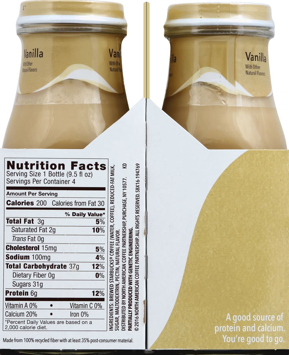 Ingredients: Brewed Starbucks Coffee (Water, Coffee), Reduced-Fat Milk, Sugar, Maltodextrin, Pectin, Natural Flavor