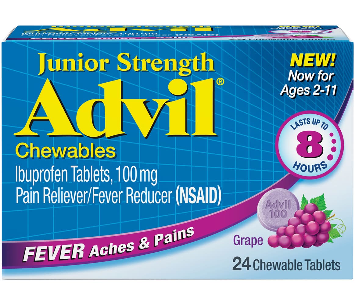 Advil Junior Strength Grape Ibuprofen Tablets provide 100 mg of ibuprofen in a chewable form, with a grape flavor. Each package contains 24 tablets. Designed for ease of use, these chewable tablets are formulated to relieve minor aches and pains. Ages 6 To 11 Medical prescription is required