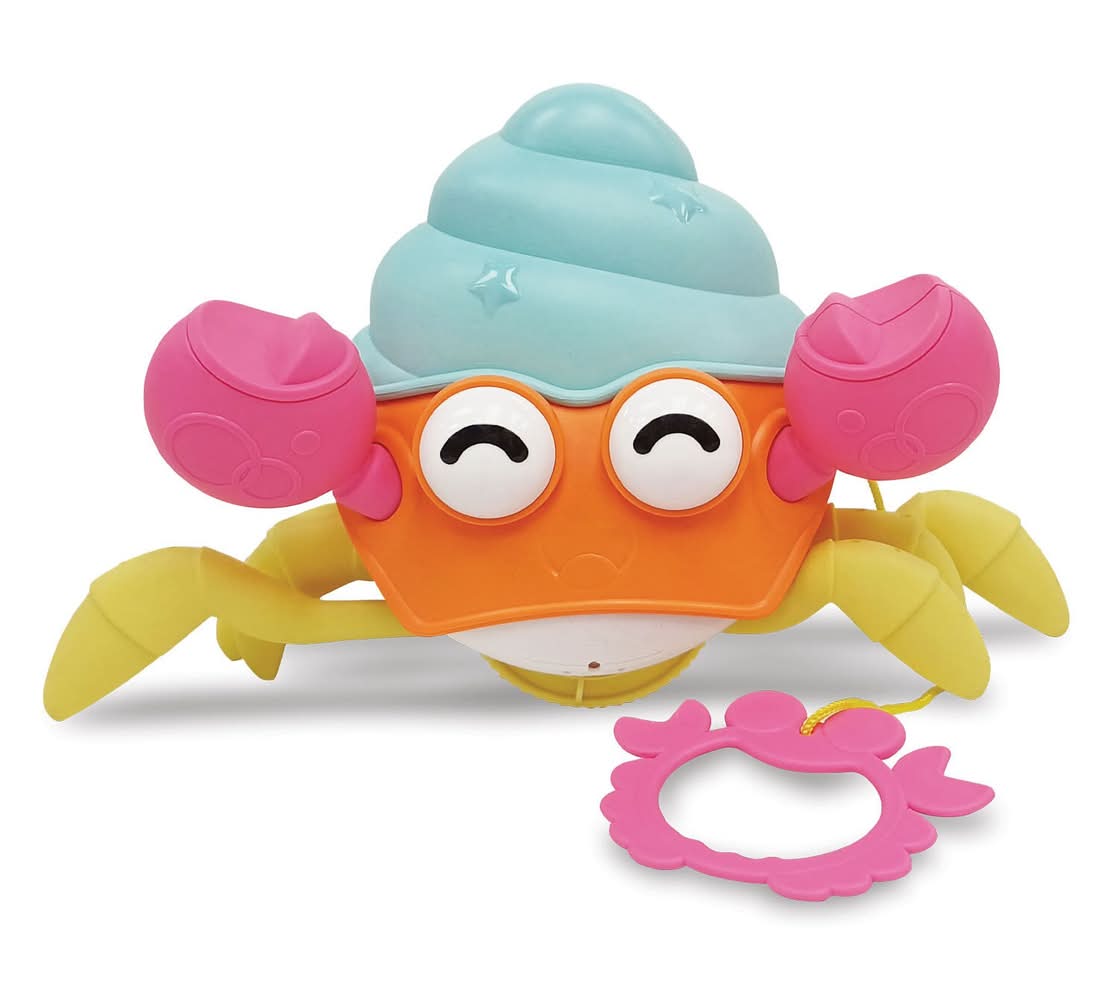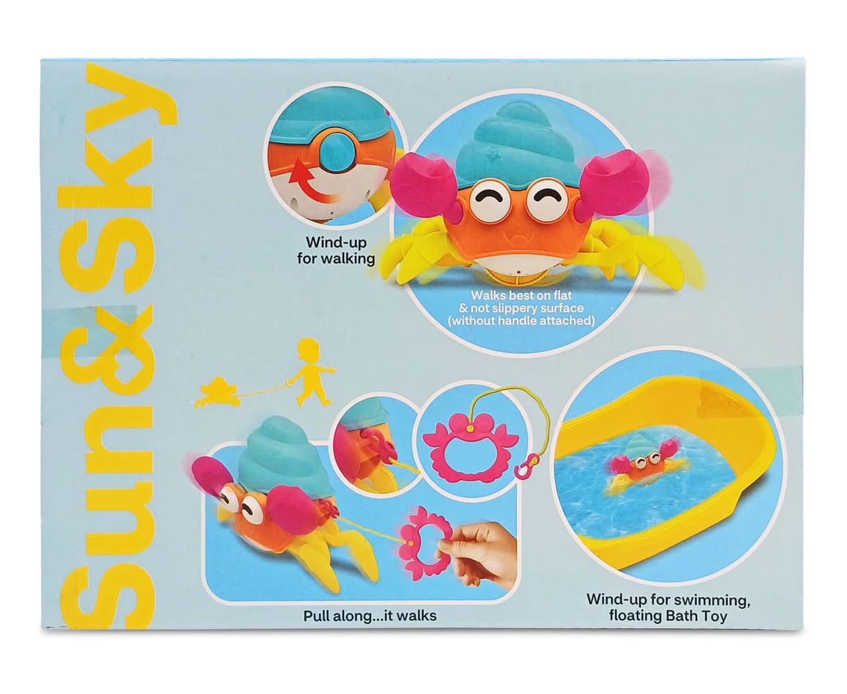 This Hermit Crab will walk long with you, on a flat surface, when it is wound up. Will float in the bath tub or swim along when wound up. 7" Playful Walking Hermit Crab Wind-up for pulling or walking along on a flat surface Wind-up for bath tub swimming (it floats!) Fun on land or in the tub! Size: 7 In