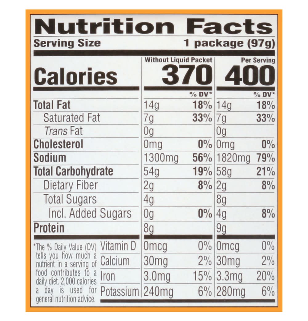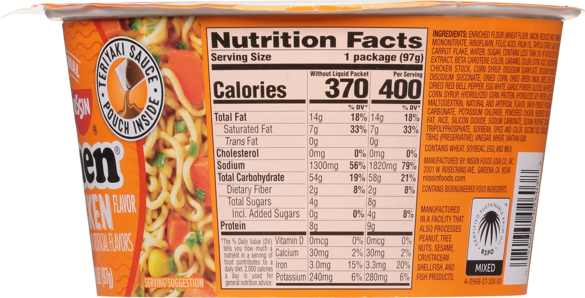 With natural and artificial flavors. Contains bioengineered food ingredients. Ready in 3 minutes - no pot needed! The original. Teriyaki sauce pouch inside. No added MSG (Contains small amounts of naturally occurring glutamates). Flavor: Chicken