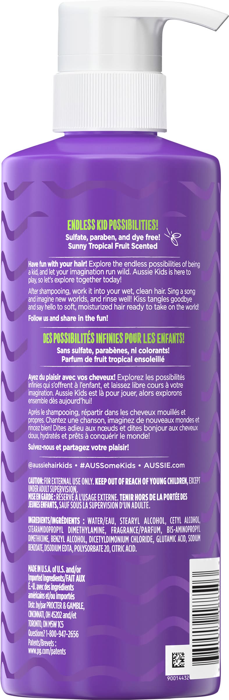 Sulfate free. Paraben free. Endless kid possibilities! Sulfate, paraben, and dye free! Have fun with your hair! Explore the endless possibilities of being a kid, and let your imagination run wild. Aussie Kids is here to play, so let's explore together today! aussie.com. Follow us and share in the fun! (at)aussiehairkids. (hashtag)AUSSomeKids. Questions? 1-800-947-2656. Made in U.S.A. of U.S. and/or imported ingredients.