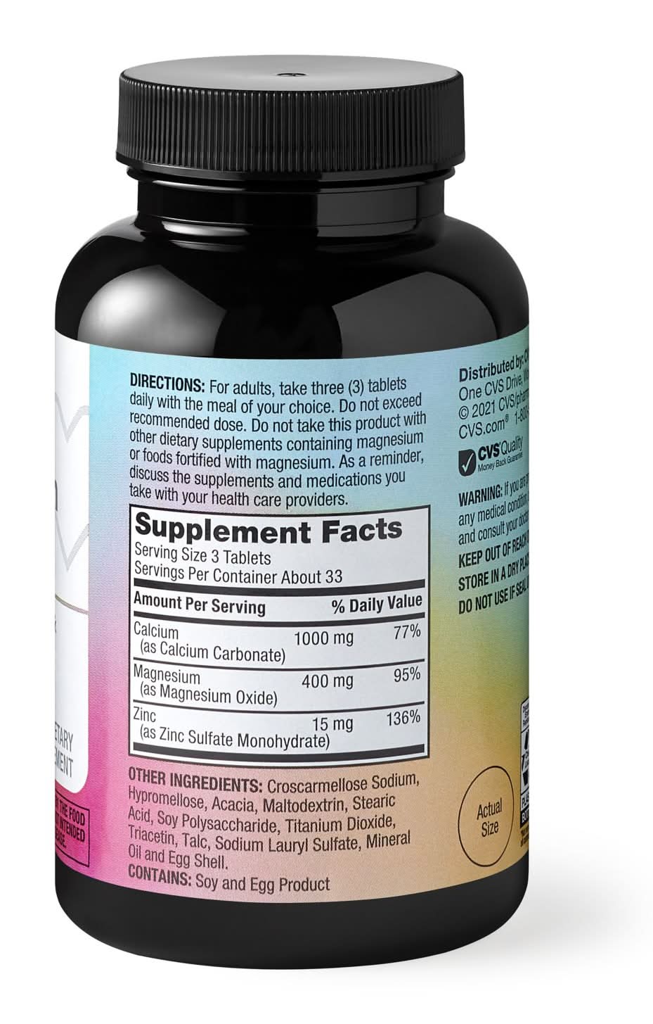 CVS Health Calcium & Magnesium with Zinc Tablets contain important vitamins and minerals that your body needs to help function. This dietary supplement product is formulated with zinc to help support a healthy immune and magnesium to help support nerve and muscle function. Take them as directed per the product packaging to help supplement your diet with calcium, an essential mineral that supports healthy teeth and bones. Calcium may play a role in nerve transmission, muscle function, and other metabolic functions. These easy to swallow tablets can help support bone health. Use this product as directed per the product packaging or ad directed by your healthcare provider. TESTED TO BE TRUSTED This product has been thoroughly tested – we require that all vitamins & supplements are third-party tested to help ensure they contain the listed dietary ingredients. With CVS Health Products, quality is our commitment as we provide you with the things you may need to help support your body's health and well-being. Discuss these supplements with your doctor or other healthcare provider before starting a new supplement plan. This item is part of our Tested to be Trusted program As our commitment to you and your family, we require third-party laboratory testing of all vitamins and supplements A product sample is tested for certain contaminants and, whenever possible, the identity and potency of dietary ingredients Our suppliers are required to manufacture products in facilities that are registered with the FDA. Dietary supplement Formulated with calcium, magnesium, and zinc Supports bone health Easy to swallow tablets 100-count CVS Health quality