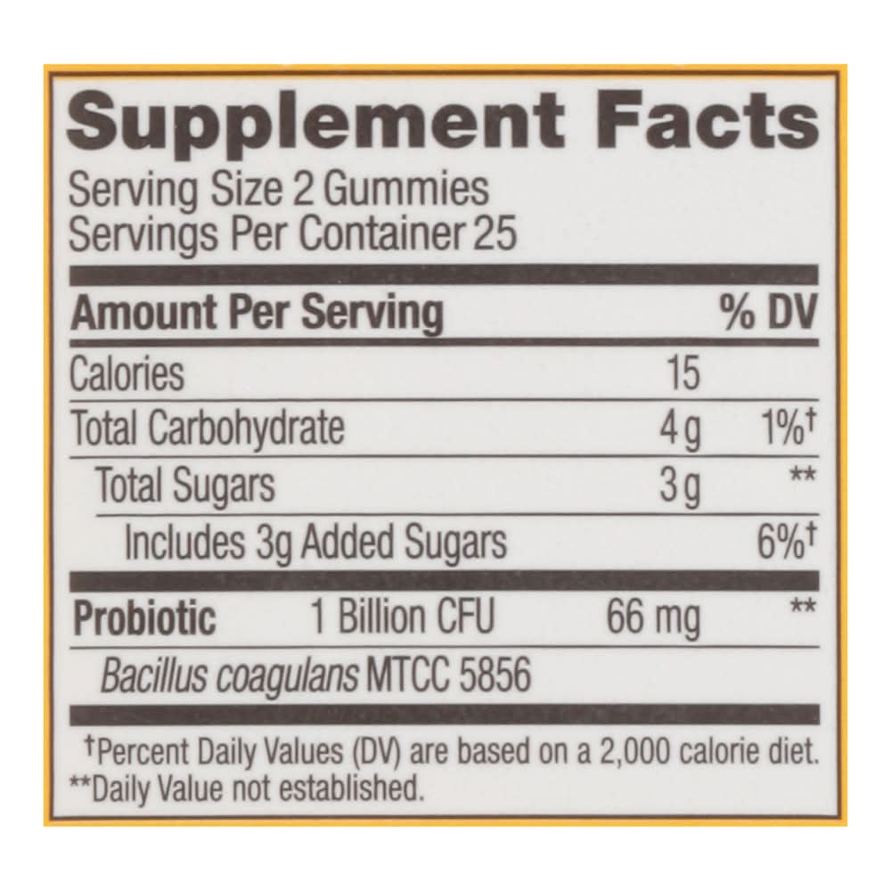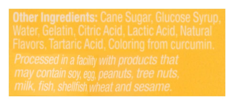 Ingredients: Bacillus Coagulans Glucose syrup, Cane Sugar, Water, Gelatin, Citric Acid, Lactic Acid, Natural Flavor (mango), Tartaric Acid, Color (from curcumin). Contains: Soybeans, Eggs, Peanuts, Tree Nuts, Milk, Fish, Crustacean Shellfish, Molluscan Shellfish, Wheat, Sesame