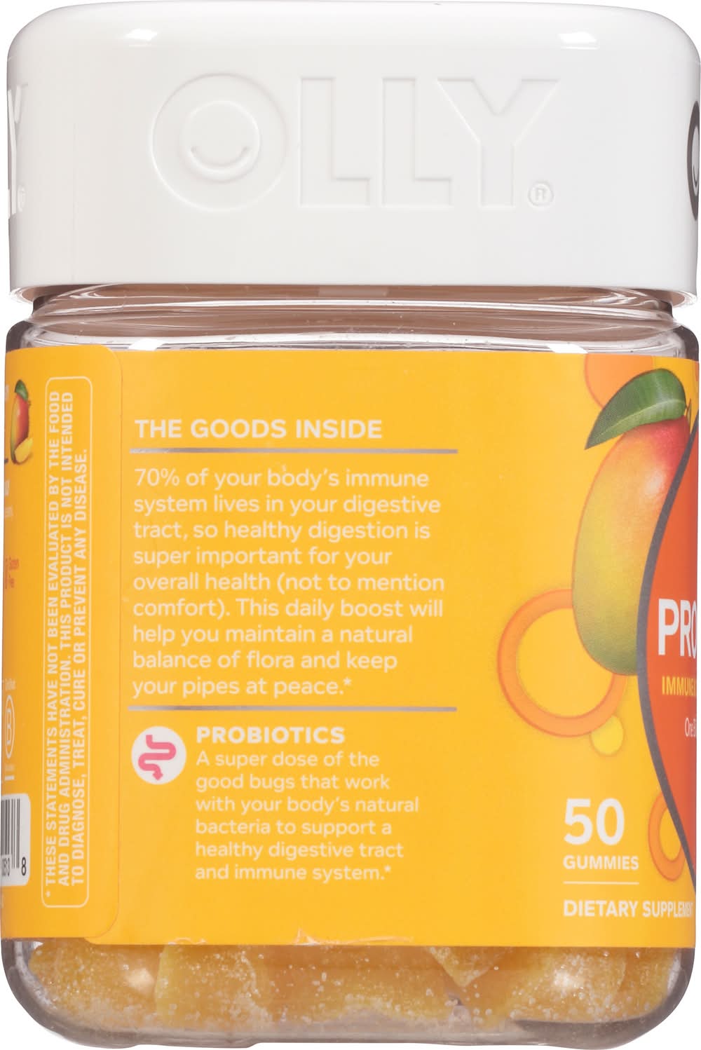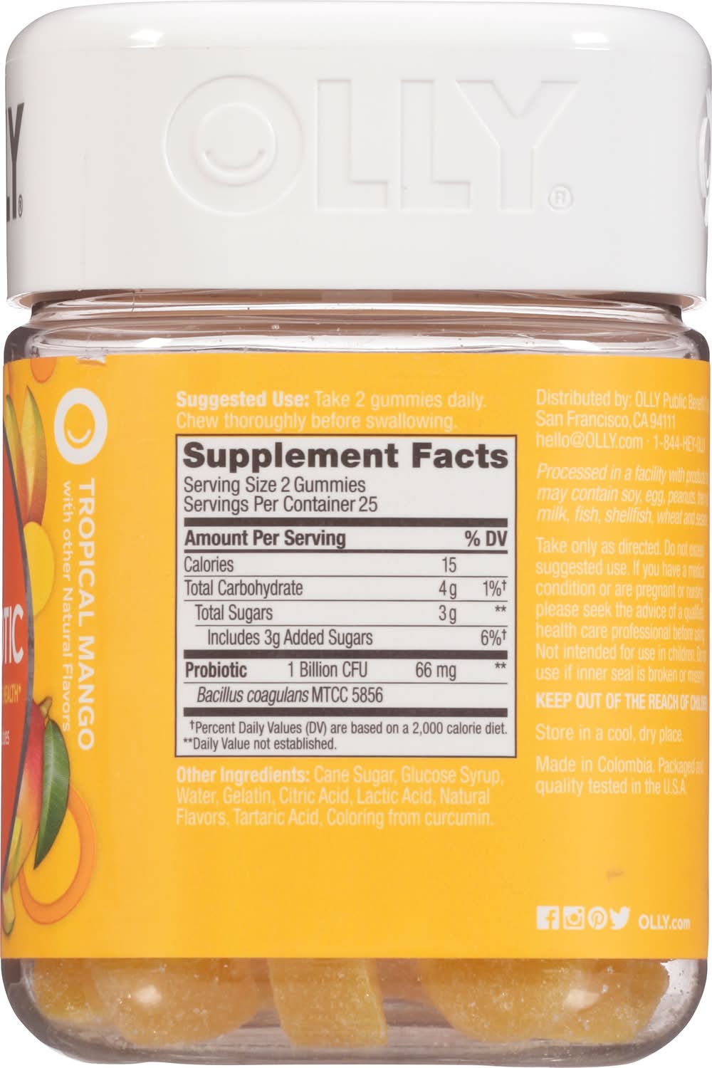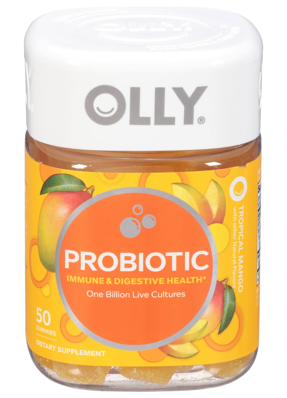 LLY Probiotic in Tropical Mango flavor gives you friendly good gut bacteria. This encourages your natural flora to thrive which helps keep your tummy and tract in tip-top shape. 70% of your body’s immune system lives in your digestive tract, so gut health is super important for your overall health.*Probiotic Tropical Mango gummies deliver 1 billion active cultures (Bacillus subtilis) that can survive the trip through your stomach and safely make their way to your digestive tract where they get to work helping your healthy bacteria thrive.*Good health is at the center of everything we do. That's why we’ve made it our mission to make nutrition easy to understand. We do it by crafting products that are as effective as they are delicious — because we know when something feels good, you’re more likely to do it.**These statements have not been evaluated by the Food and Drug Administration. This product is not intended to diagnose, treat, cure or prevent any disease.TESTED TO BE TRUSTED We require that all vitamins & supplements are third-party tested to help ensure they contain the listed dietary ingredients. To learn more, please visit cvs.com/tested-trusted. This item is part of our Test to be Trusted Program Please visit https://www.cvs.com/content/tested-trusted for program details and additional information OLLY PROBIOTIC TROPICAL MANGO: Probiotics encourage your flora to thrive which helps keep your tummy and tract feeling good. 70% of your body’s immune system lives in your digestive tract, so gut health is super important for overall health* THE GOODS INSIDE: OLLY Probiotic gummies deliver 1 billion active cultures (Bacillus subtilis) that make their way to your digestive tract where they help your healthy bacteria thrive* HOW TO TAKE: Chew two OLLY gummies, no food or water needed DELIGHTFULLY TASTY: Tropical Mango Flavor with no synthetic flavors or colors and are gluten free. 50 gummies per bottle (25 day supply) MIX AND MATCH: We’ve got supplements to keep you tip-top from head to toe—browse the benefits from Sleep support to Multivitamins, and find the OLLY routine that fits you and your crew. • Olly Public Benefit Corp., San Francisco,CA,94129 • Packaging: Reusable