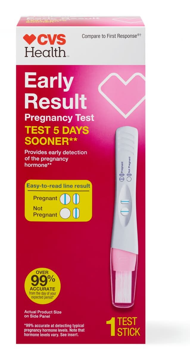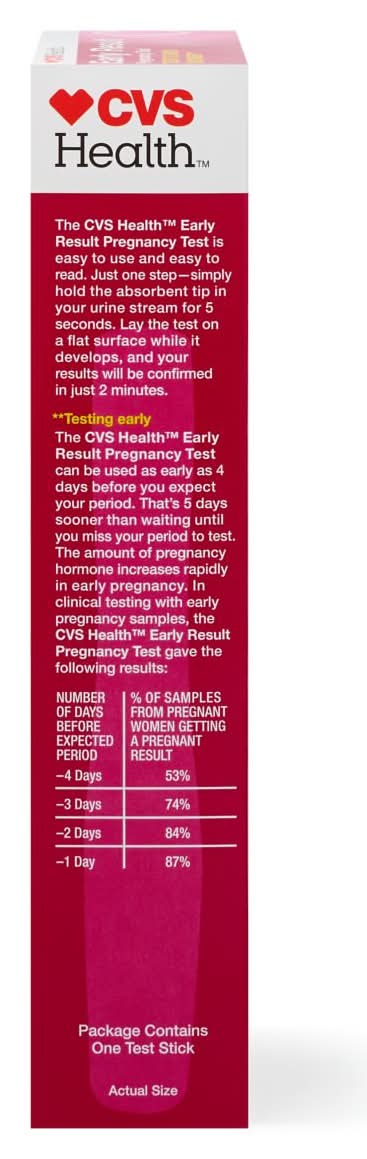Test 5 days sooner. Provides early detection of the pregnancy hormone. CVS pharmacist recommended. Over 99% accurate (99% accurate at detecting typical pregnancy hormone levels. Note that hormone levels vary.) from the day of your expected period. Early Result Pregnancy Test is easy to use and easy to read. Just one step - simply hold the absorbent tip in your urine stream. Results are confirmed in just 2 minutes. Testing Early: The Early Result Pregnancy Test can be used as early as 4 days before you expect your period. That's 5 days sooner than waiting until you miss your period to test. The amount of pregnancy hormone increases rapidly in early pregnancy. Simple one step process. Comfortable thumb grip. Results in 2 minutes. For in-vitro diagnostic use. (Not for internal use.) Made in UK. Assembled in China. Packaged in the USA.
