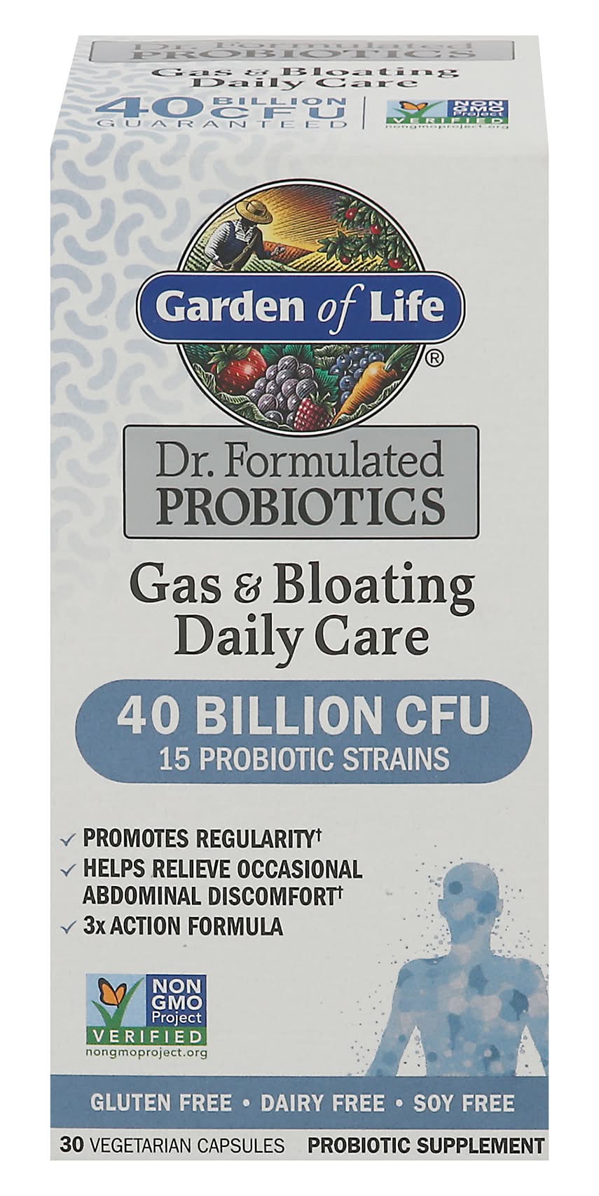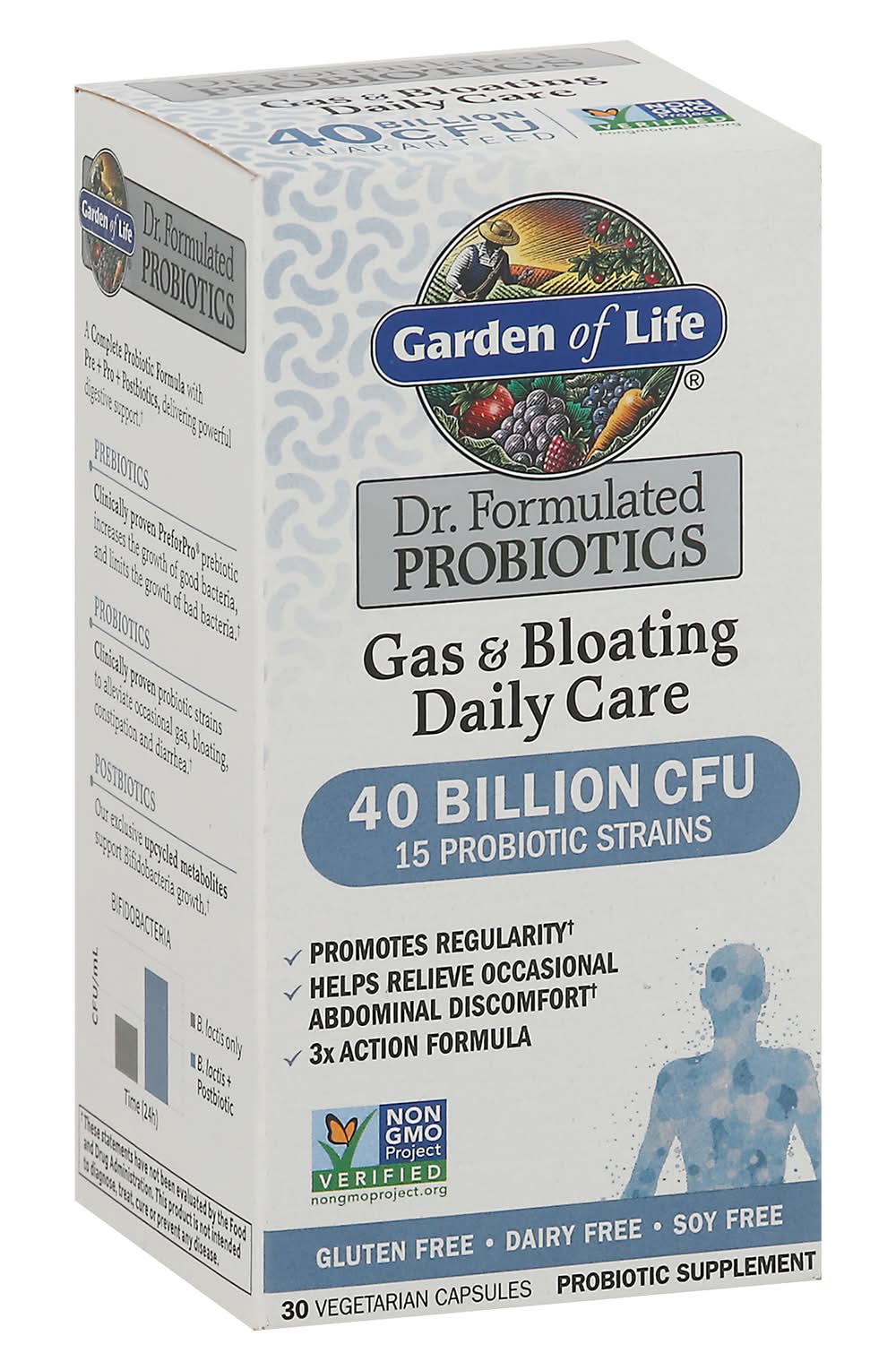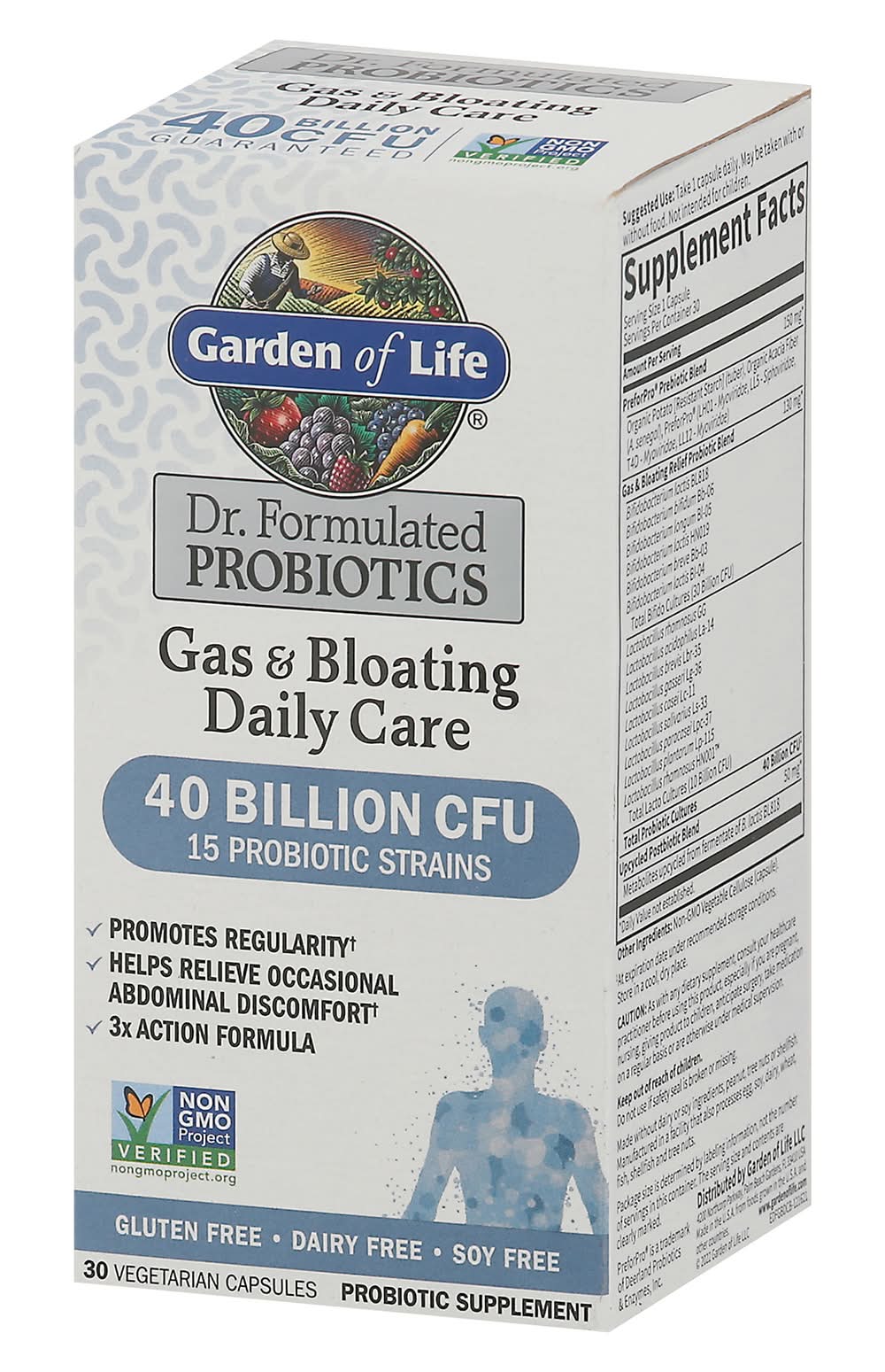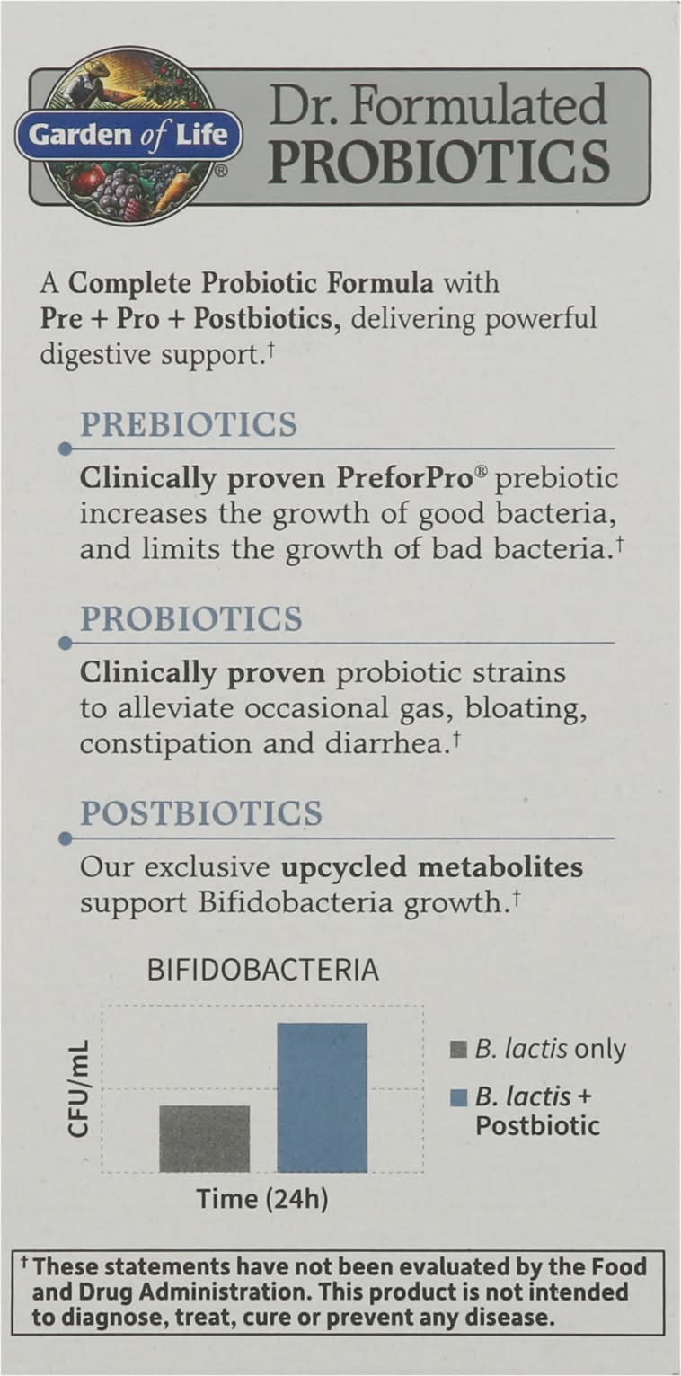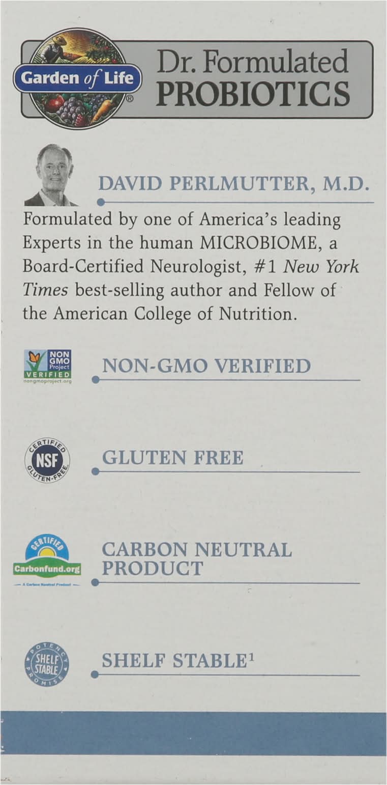 Probiotic Supplement. Gluten free. Dairy free. Soy free. NSF: Certified gluten-free. Made without dairy or soy ingredients, peanut, tree nuts or shellfish. probiotic strains. Promotes regularity. Helps relieve occasional abdominal discomfort. 3x Action formula. 40 Billion CFU guaranteed. David Perlmutter, M.D. Formulated by one of America's leading Experts in the human microbiome, a Board-Certified Neurologist, no.1 New York Times best-selling author and fellow of the American College of Nutrition. A Complete Probiotic Formula with Pre + Pro + Postbiotics, delivering powerful digestive support. Prebiotics: Clinically proven PreforPro prebiotic increases the growth of good bacteria, and limits the growth of bad bacteria. Probiotics: Clinically proven probiotic strains to alleviate occasional gas, bloating, constipation and diarrhea. Postbiotics: Our exclusive upcycled metabolites support Bifidobacteria growth. Package size is determined by labeling information, not the number of servings in this container. The serving size and contents are clearly marked. Carbon Neutral Product. carbonfund.org. (These statements have not been evaluated by the Food and Drug Administration. This product is not intended to diagnose, treat, cure or prevent any disease.) Made in the U.S.A. from foods grown in the U.S.A. and other countries.